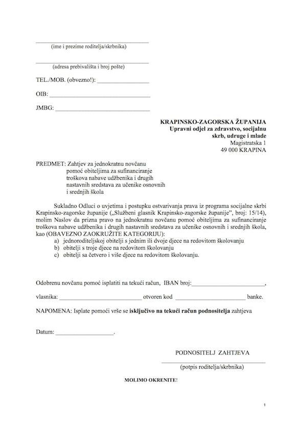 Zahtjevi se zaprimaju do 31. listopada 2014. godine a podnose se na obrascu, osobno u Upravnom odjelu za zdravstvo, socijalnu skrb, udruge i mlade ili poštom na adresu: Krapinsko-zagorska županija, Magistratska 1, 49 000 Krapina.
