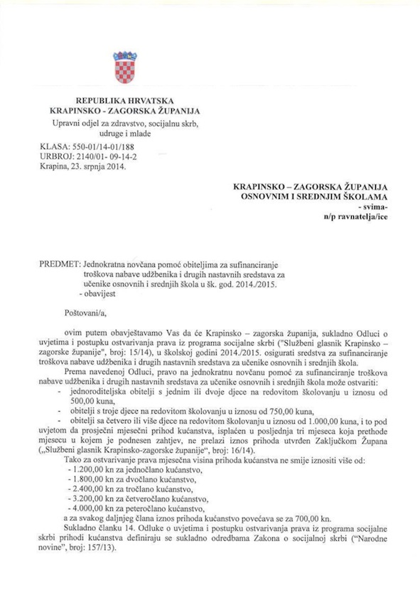 Krapinsko – zagorska županija već petu godinu zaredom osigurava sredstva za sufinanciranje troškova nabave udžbenika i drugih nastavnih sredstava za učenike osnovnih i srednjih škola. Lani je za ovu mjeru iz županijskog proračuna izdvojeno 232 tisuće kuna, dok je za ovu godinu u proračunu predviđeno 250 tisuća kuna.