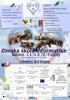 Srednja škola Krapina i ove godine je domaćin Zimske škole informatike u vremenu od 2. 01 - 10. 01. 2015. godine. Radionice će biti trodnevne (3.4. i 5. siječnja te 7. 8. i 9. siječnja. Prijave traju do 17. prosinca, a 18. prosinca bit će objavljen službeni raspored na web stranicama škole. Nakon 17. prosinca moći će se prijaviti samo u eventualno nepopunjene radionice.