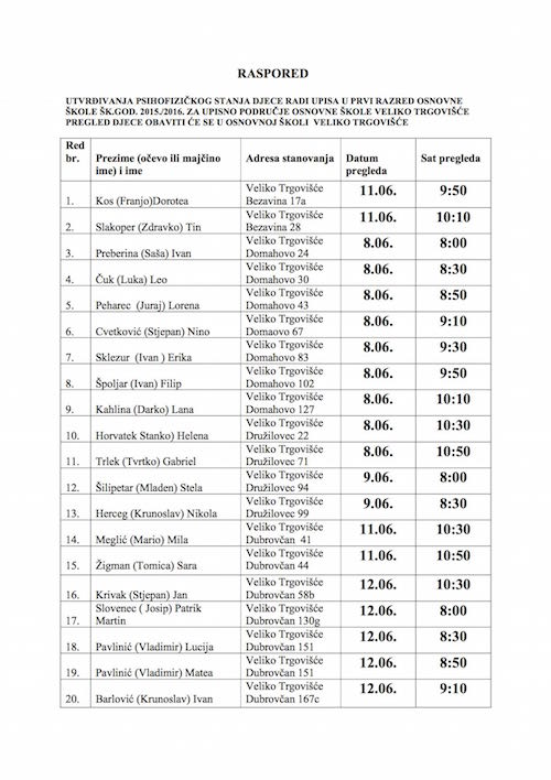 RASPORED UTVRĐIVANJA PSIHOFIZIČKOG STANJA DJECE RADI UPISA U PRVI RAZRED OSNOVNE ŠKOLE ŠK.GOD. 2015./2016.