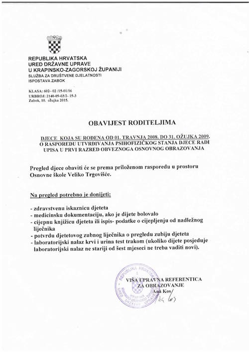 OBAVIJEST RODITELJIMA                                RASPORED