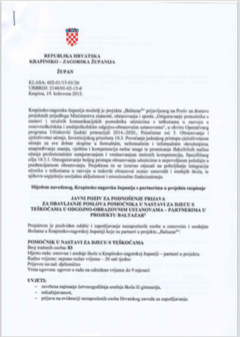 JAVNI POZIV ZA PODNOŠENJE PRIJAVA ZA OBAVLJANJE POSLOVA POMOMOĆNIKA U NASTAVI ZA DJECU S TESKOĆAMA U ODGOJNO-OBRAZOVNIM USTANOVAMA - PARTNERIMA U PROJEKTU BALTAZAR 3