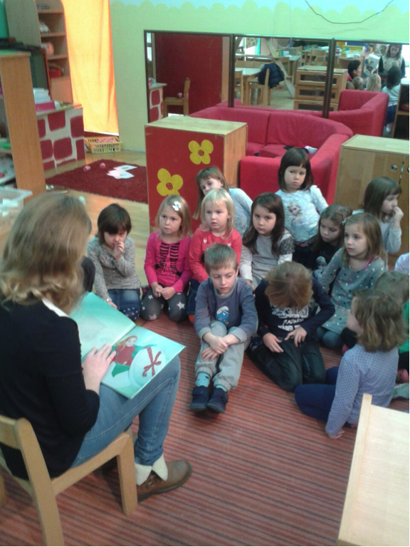 10. prosinca 2015. godine u jutarnjim satima, učenice 6. razreda OŠ Veliko Trgovišće, Lea Lang i Petra Marec, u pratnji knjižničarke Vlatke Habulin, posjetile su Dječji vrtić Rožica u Velikom Trgovišću i održale prvo čitanje bajke dvjema skupinama djece. Kako se nalazimo u adventskom vremenu, knjižničarka je izabrala prigodnu bajku naziva „Božićni snjegović“ , spisateljice Ele Peroci.