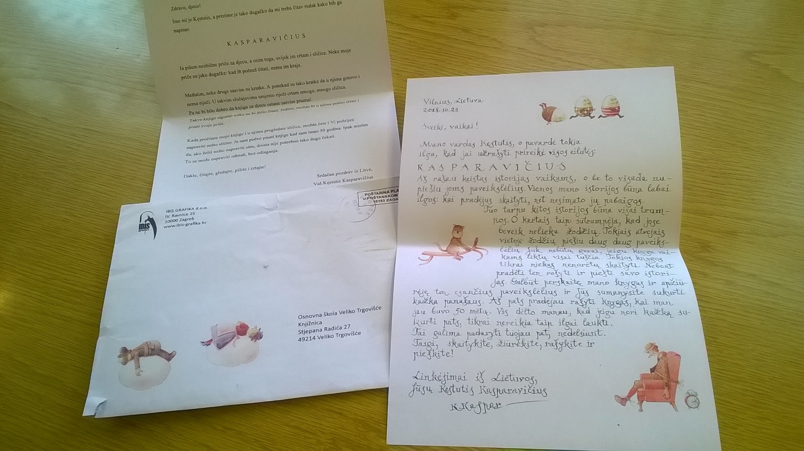 Učenicima koji sudjeluju u Projektu Naša mala knjižnica stiglo je pismo iznenađenja, koje im je napisao, oslikao i poslao litvanski književnik Kestutis Kasparavičius, čiju knjigu pod naslovom Lijenozemska učenici čitaju u sklopu Projekta.