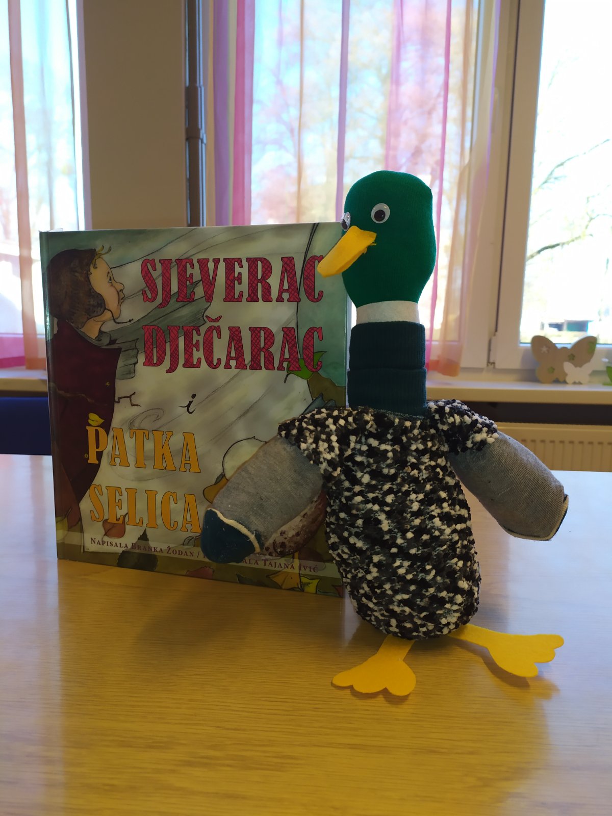 Nakon što su učiteljica Nataša i knjižničarka Vlatka učenicima u produženom boravku pročitale priču Sjeverac dječarac i patka selica, učiteljica Nataša je vrijedno prionula izradi lutke patke selice.