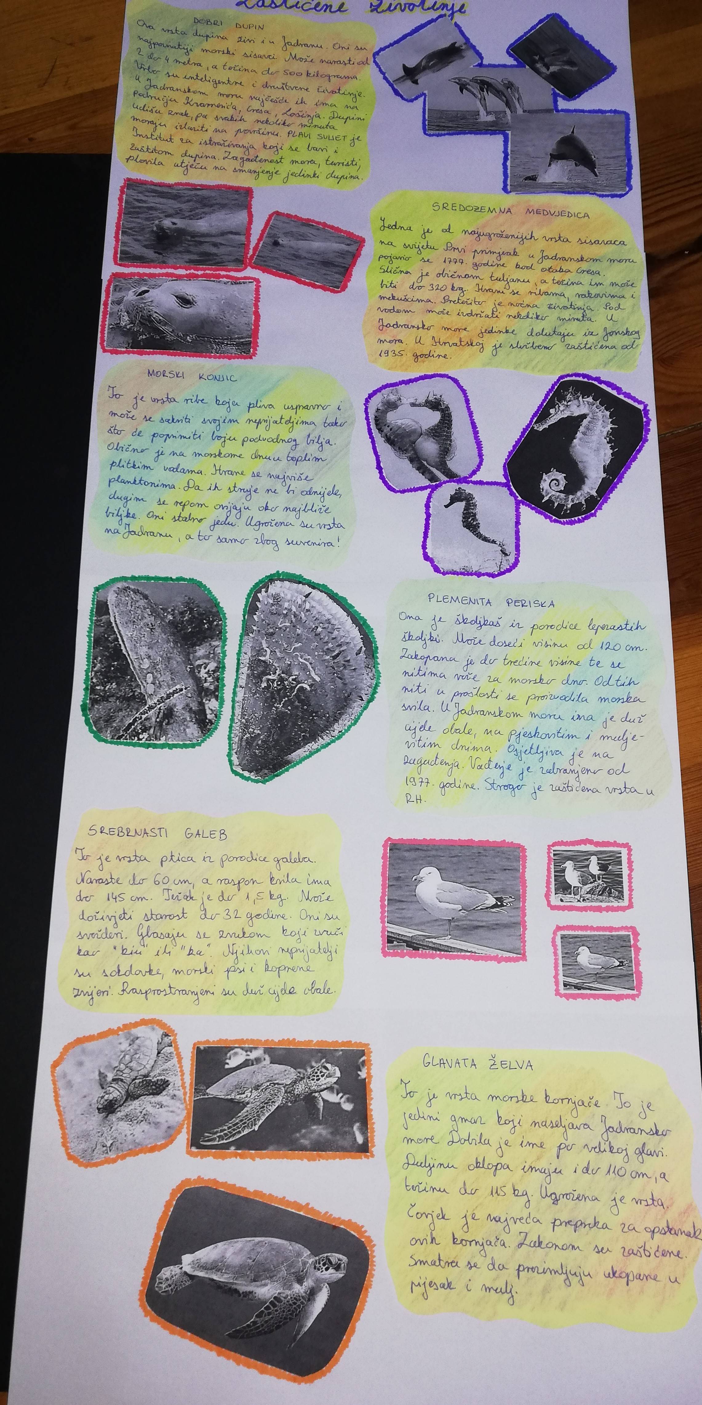 Učenici u produženom boravku nastavljaju s projektom Naša mala knjižnica i u online okruženju: knjižničarka Vlatka im čita Bodljikavu knjigu, svaki tjedan po jedno ili više poglavlja - bodlji. Prošli tjedan učenici su od učiteljice Nataše dobili zadatak izraditi plakat o zaštićenim morskim vrstama koje se spominju u Bodljikavoj knjizi, a to su: sredozemna medvjedica, dobri dupin, morski konjic, plemenita periska, glavata želva i srebrnasti galeb.