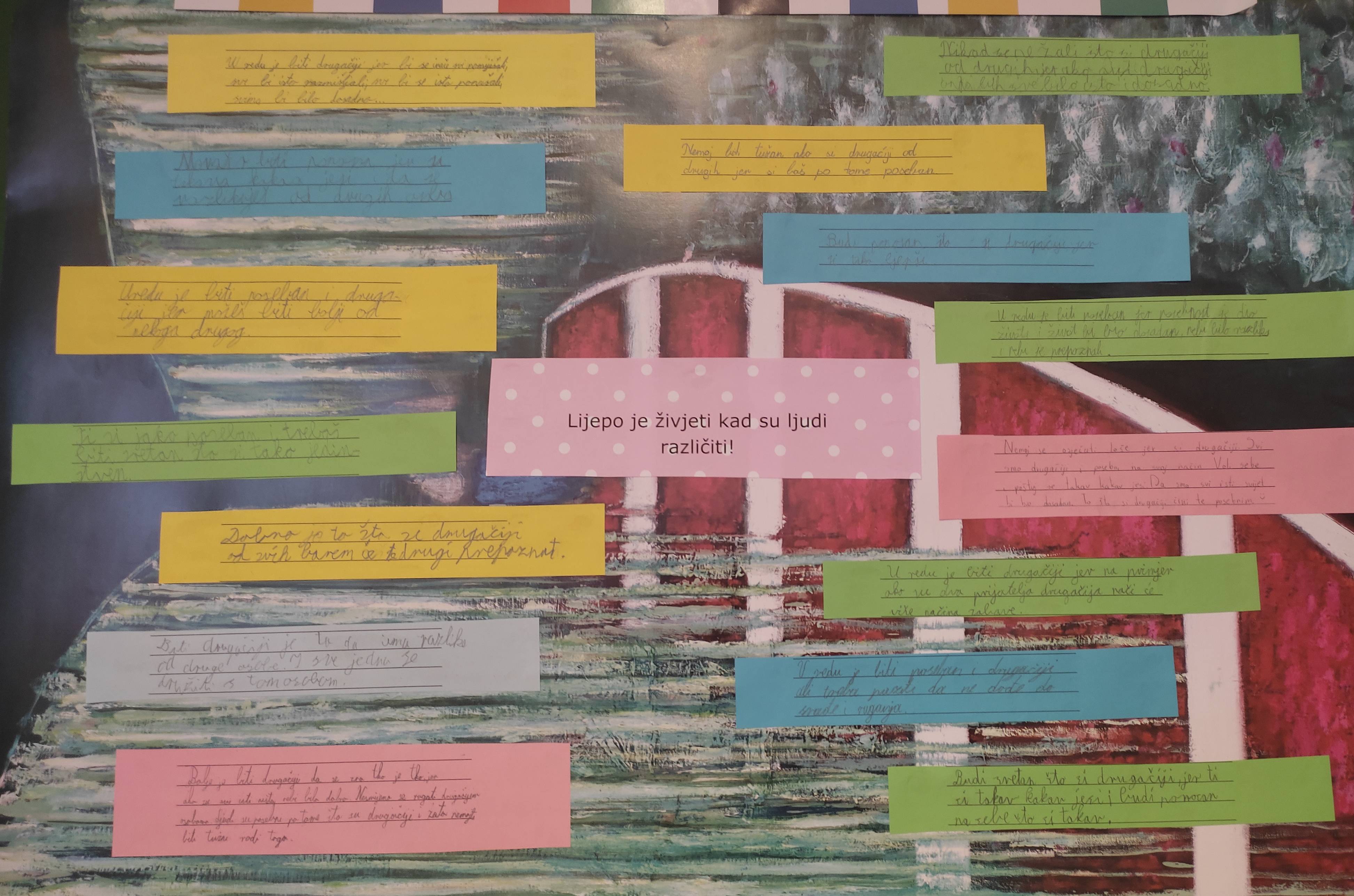 U 4. razredu smo obilježili Međunarodni dan tolerancije. Nakon čitanja slikovnice Plavi Grad, Žuti Grad, u kojoj je stanovnici dvaju gradova žele jedni drugima nametnuti svoje posebnosti bez uvažavanja različitosti i međusobnog poštovanja u razgovoru smo objasnili i opisali tolerantno ponašanje i zaključili da nas međusobne razlike obogaćuju i čine zanimljivima. Uz moto Lijepo je živjeti kad su ljudi različiti učenici su pisali poticajne poruke kojima podržavaju tuđe posebnosti i različitosti.