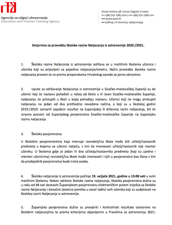 Smjernice za provedbu školske razine Natjecanja iz astronomije 2020./2021.