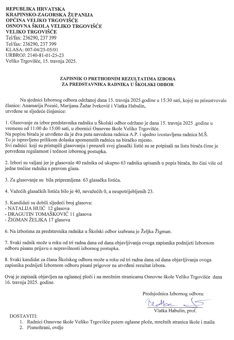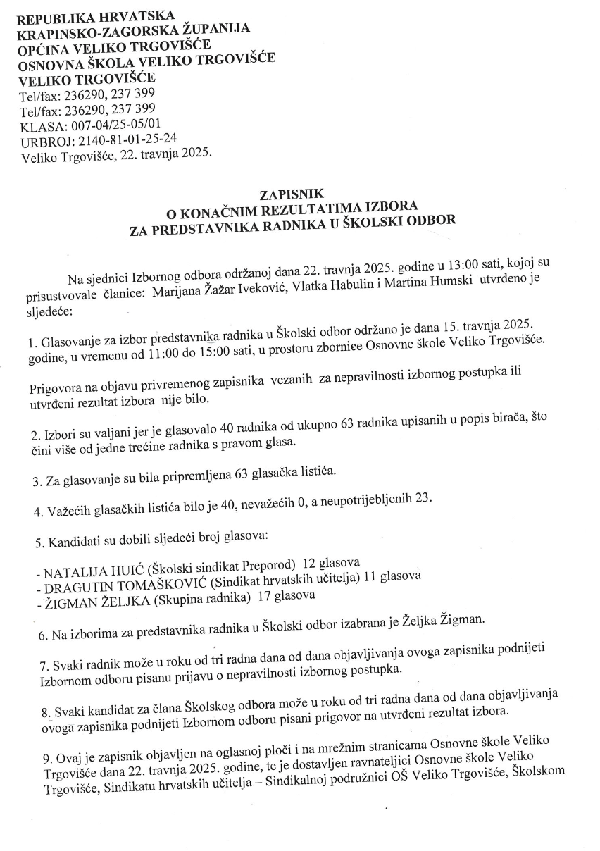 Zapisnik o konačnim rezultatima izbora za predstavnika radnika u Školski odbor