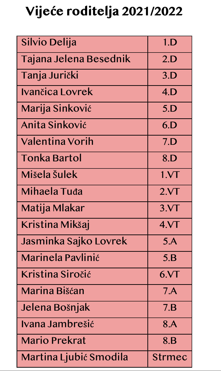 Vijeće roditelja sastavljeno je od predstavnika roditelja učenika svakog razrednog odjela.