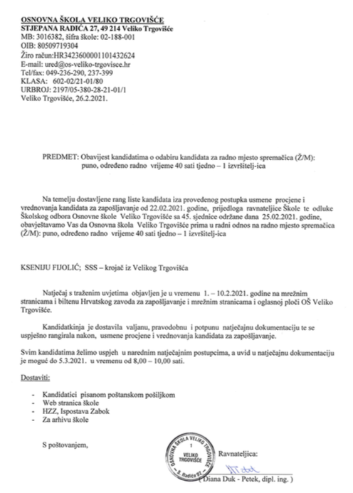 Obavijest kandidatima odabiru kandidata za radno mjesto spremaćica