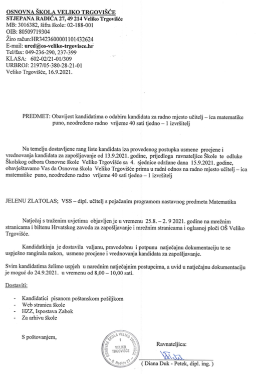 UČITELJ – ICA MATEMATIKE, puno radno vrijeme 40 sati tjedno, neodređeno – 1 izvršitelj/ica