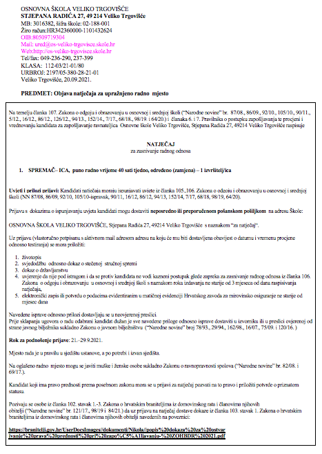 SPREMAČ– ICA, puno radno vrijeme 40 sati tjedno, određeno (zamjena) – 1 izvršitelj/ica