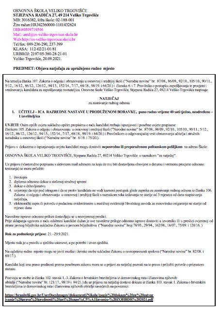 NATJEČAJ- UČITELJ – ICA RAZREDNE NASTAVE U PRODUŽENOM BORAVKU