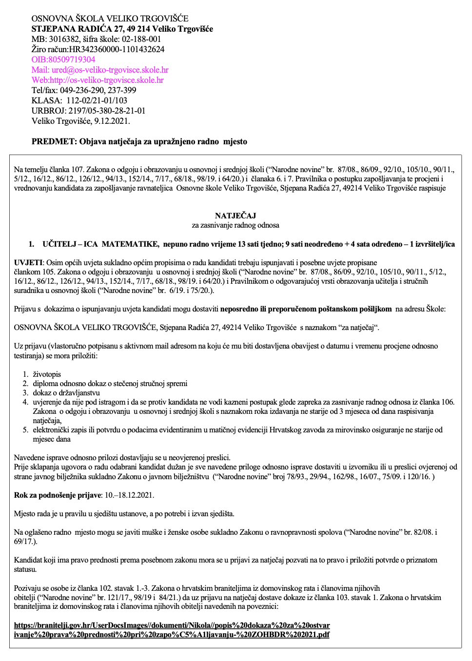 NATJEČAJ za zasnivanje radnog odnosa UČITELJ – ICA MATEMATIKE