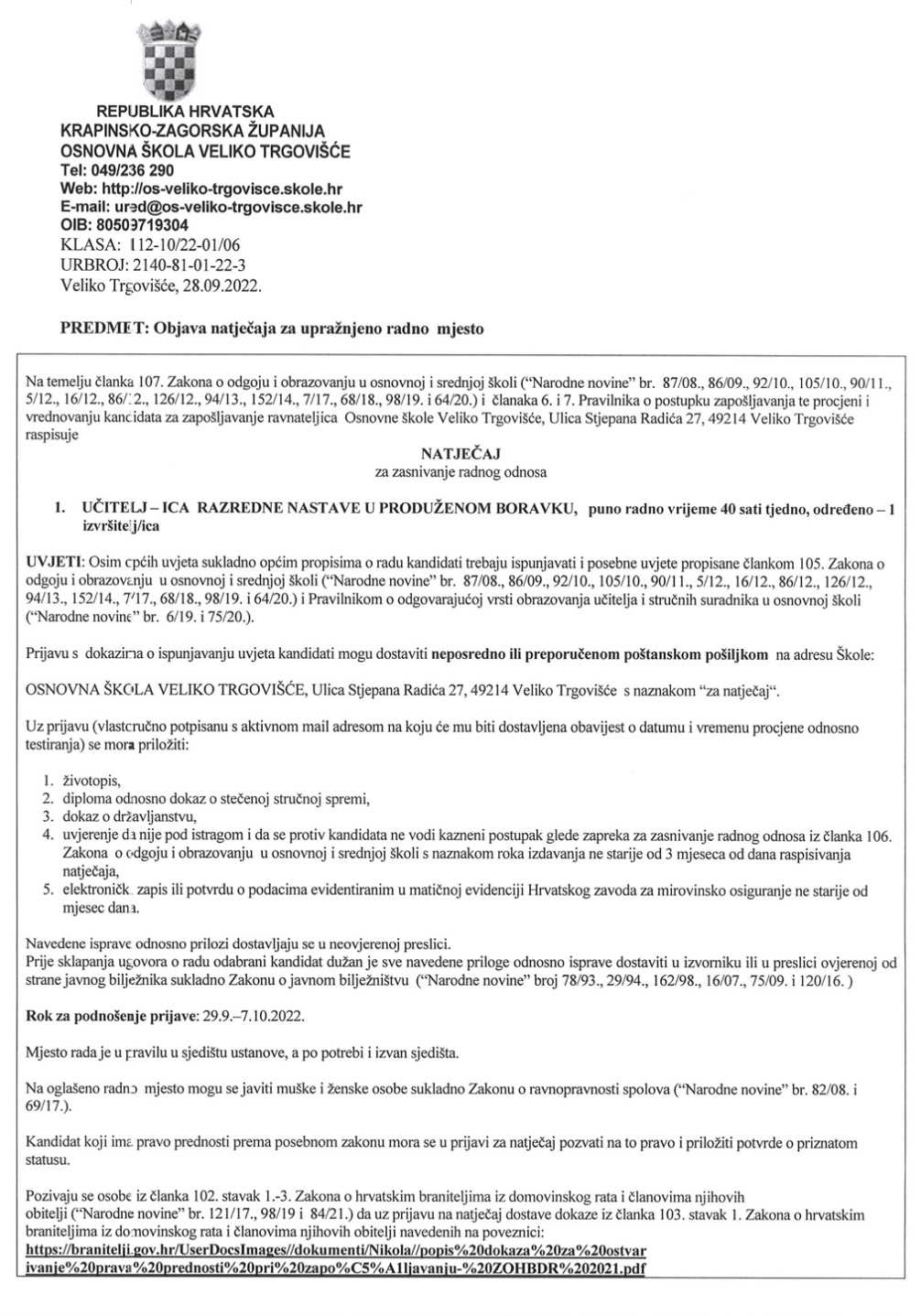 UČITELJ — ICA RAZREDNE NASTAVE U PRODUŽENOM BORAVKU, puno radno vrijeme 40 sati tjedno, određeno — 1 izvršitelj/ice