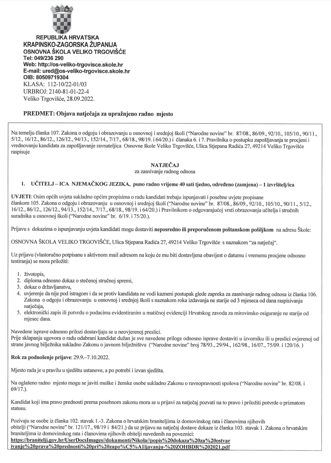 UČITELJ — ICA NJEMAČKOG JEZIKA, puno radno vrijeme 40 sati tjedno, određeno(ZAMJENA) — 1 izvršitelj/ice