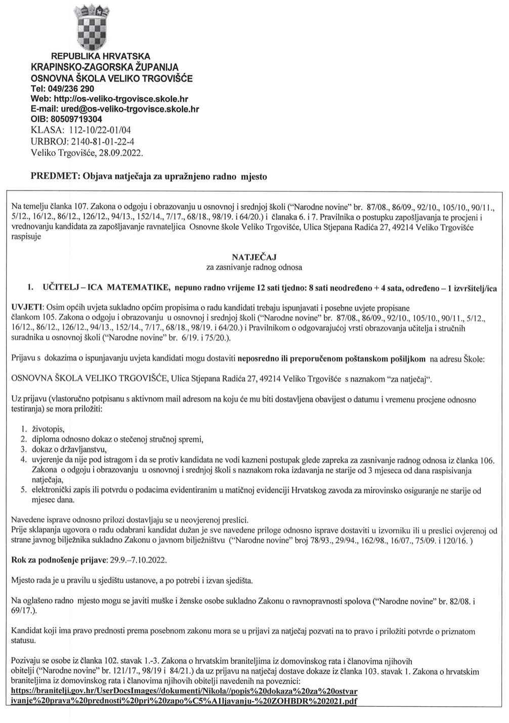UČITELJ — ICA MATEMATIKE, nepuno radno vrijeme 12 sati tjedno: 8 sati neodređeno+ 4 sata, određeno— 1 izvršitelj/ice