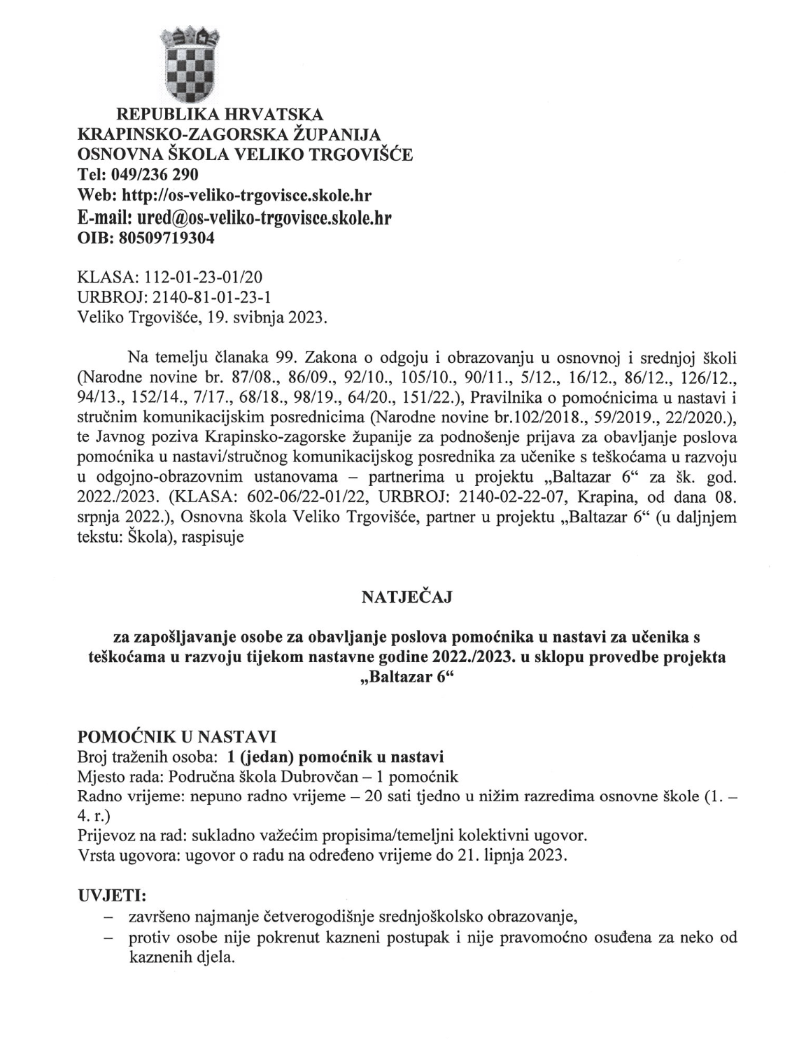 za zapošljavanje osobe za obavljanje poslova pomoćnika u nastavi za učenika s teškoćama u razvoju tijekom nastavne godine 2022./2023. u sklopu provedbe projekta „Baltazar 6"