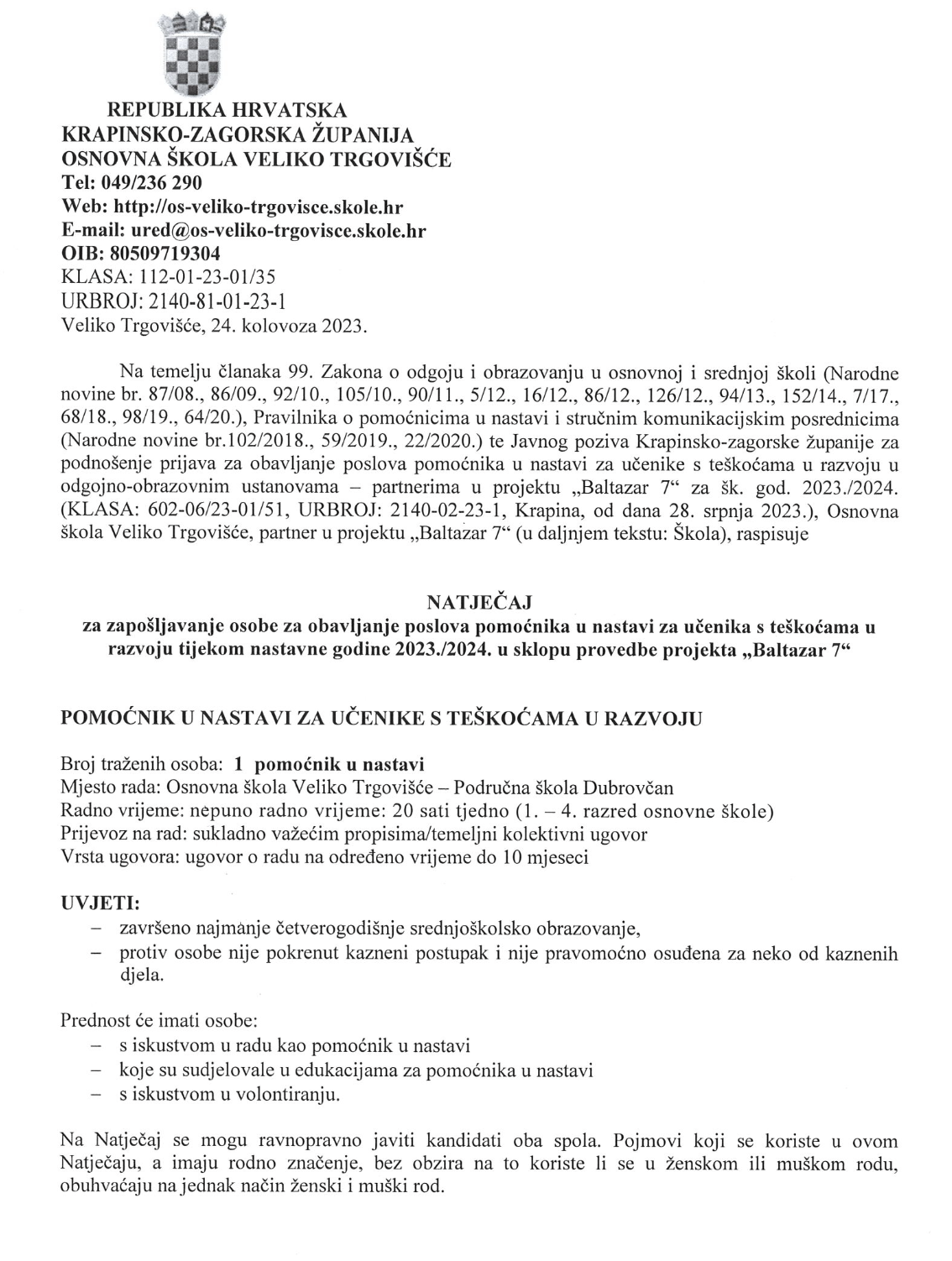 za zapošljavanje osoba za obavljanje poslova pomoćnika u nastavi za učenike s teškoćama u razvoju tijekom nastavne godine 2023./2024. u sklopu provedbe projekta „Baltazar 7“