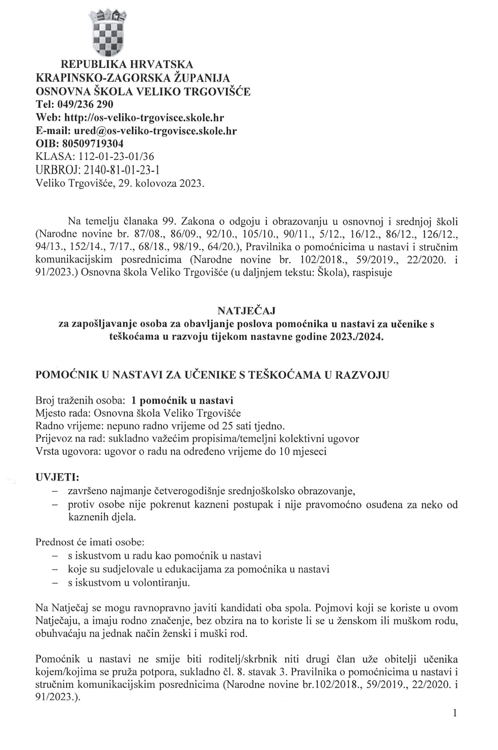 za zapošljavanje osoba za obavljanje poslova pomoćnika u nastavi za učenike s teškoćama u razvoju tijekom nastavne godine 2023./2024.