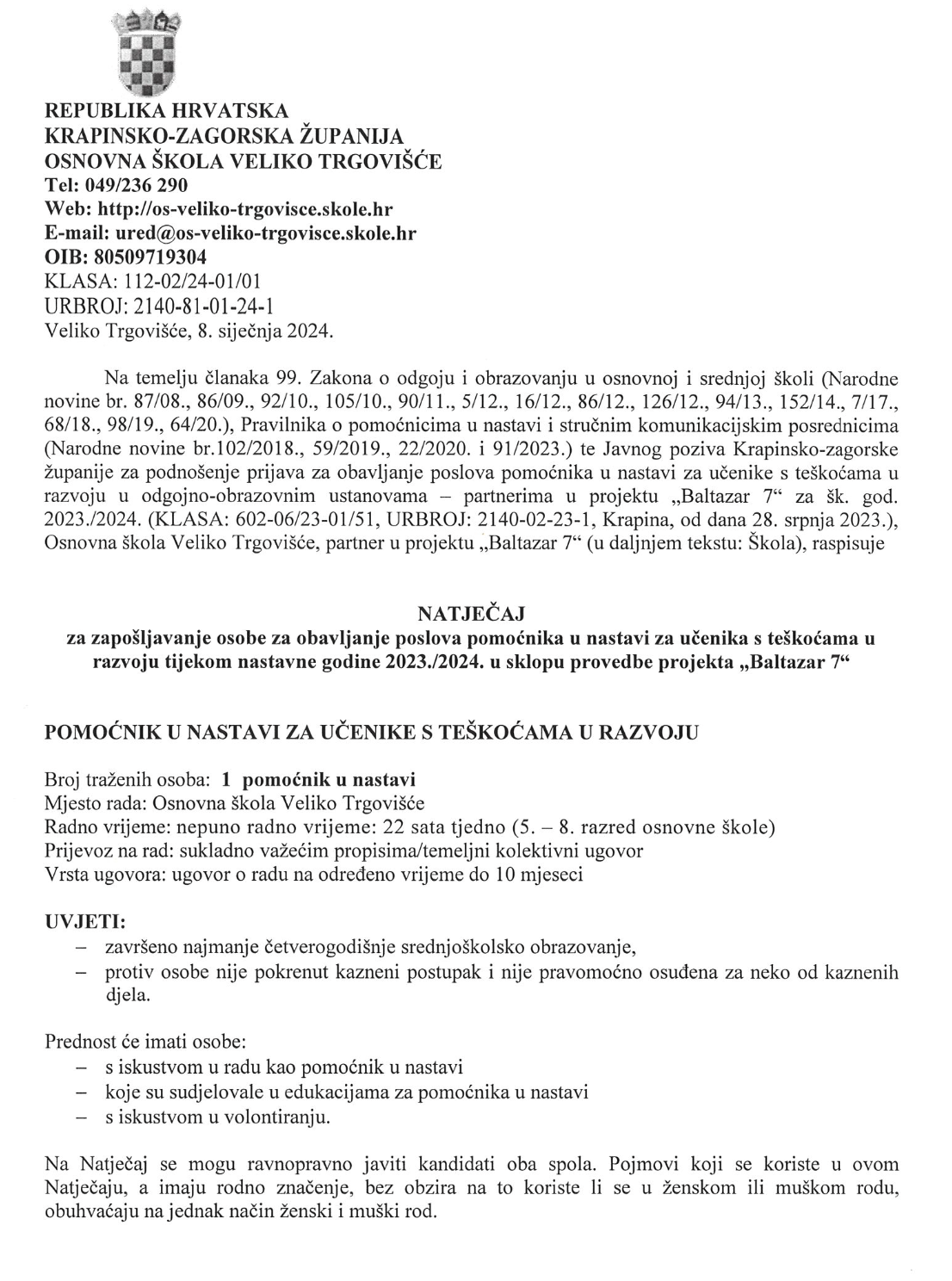 za zapošljavanje osobe za obavljanje poslova pomoćnika u nastavi za učenika s teškoćama u razvoju tijekom nastavne godine 2023./2024. u sklopu provedbe projekta „Baltazar 7“