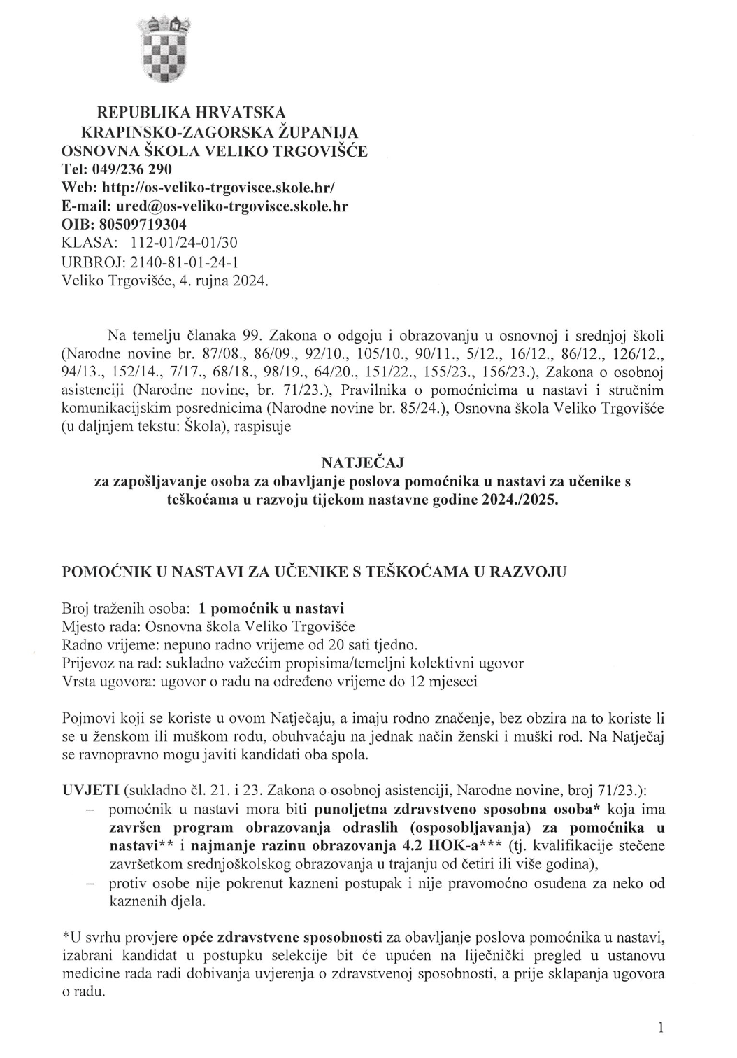 Natječaj za radno mjesto pomoćnik u nastavi za učenike s teškoćama u razvoju