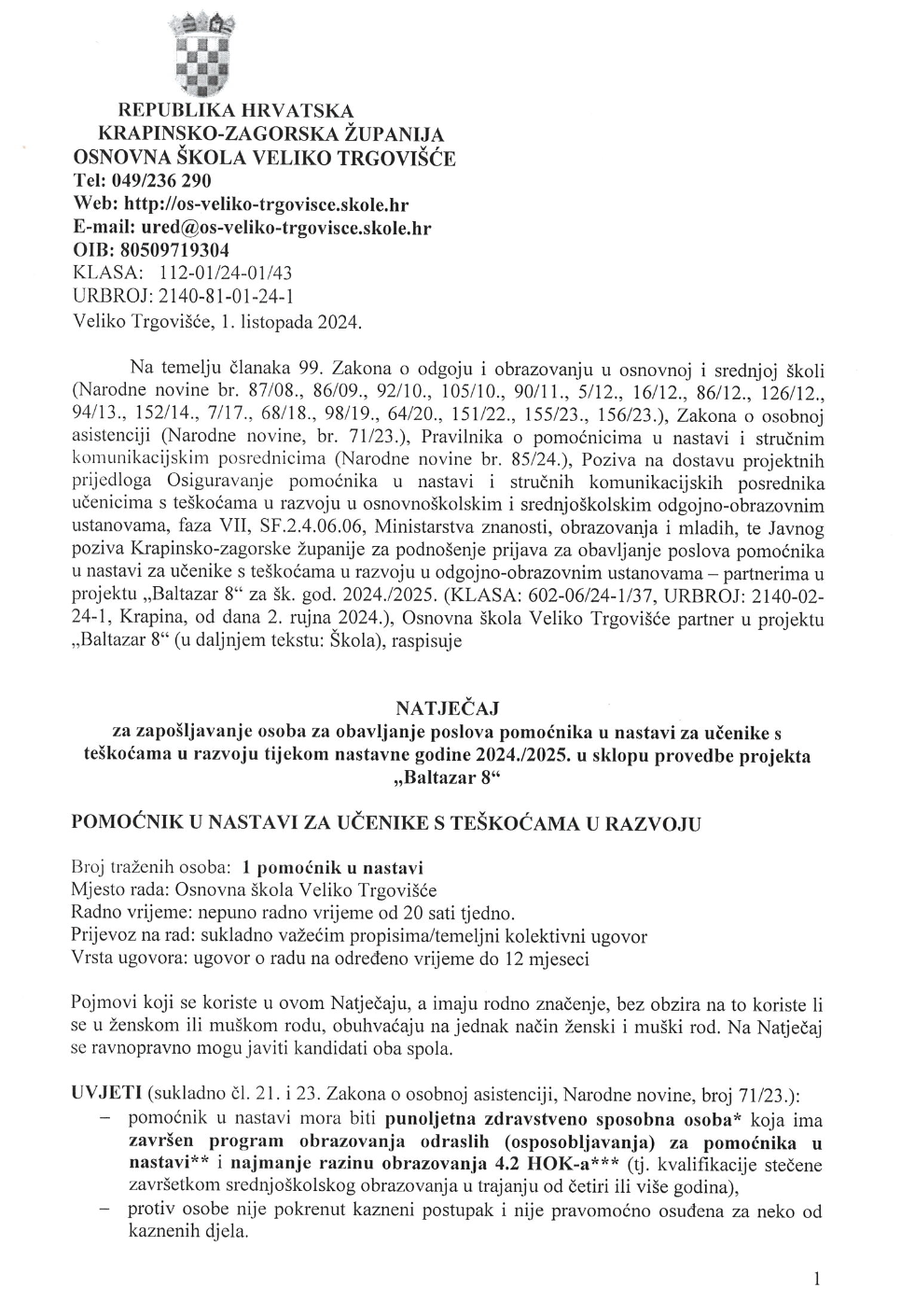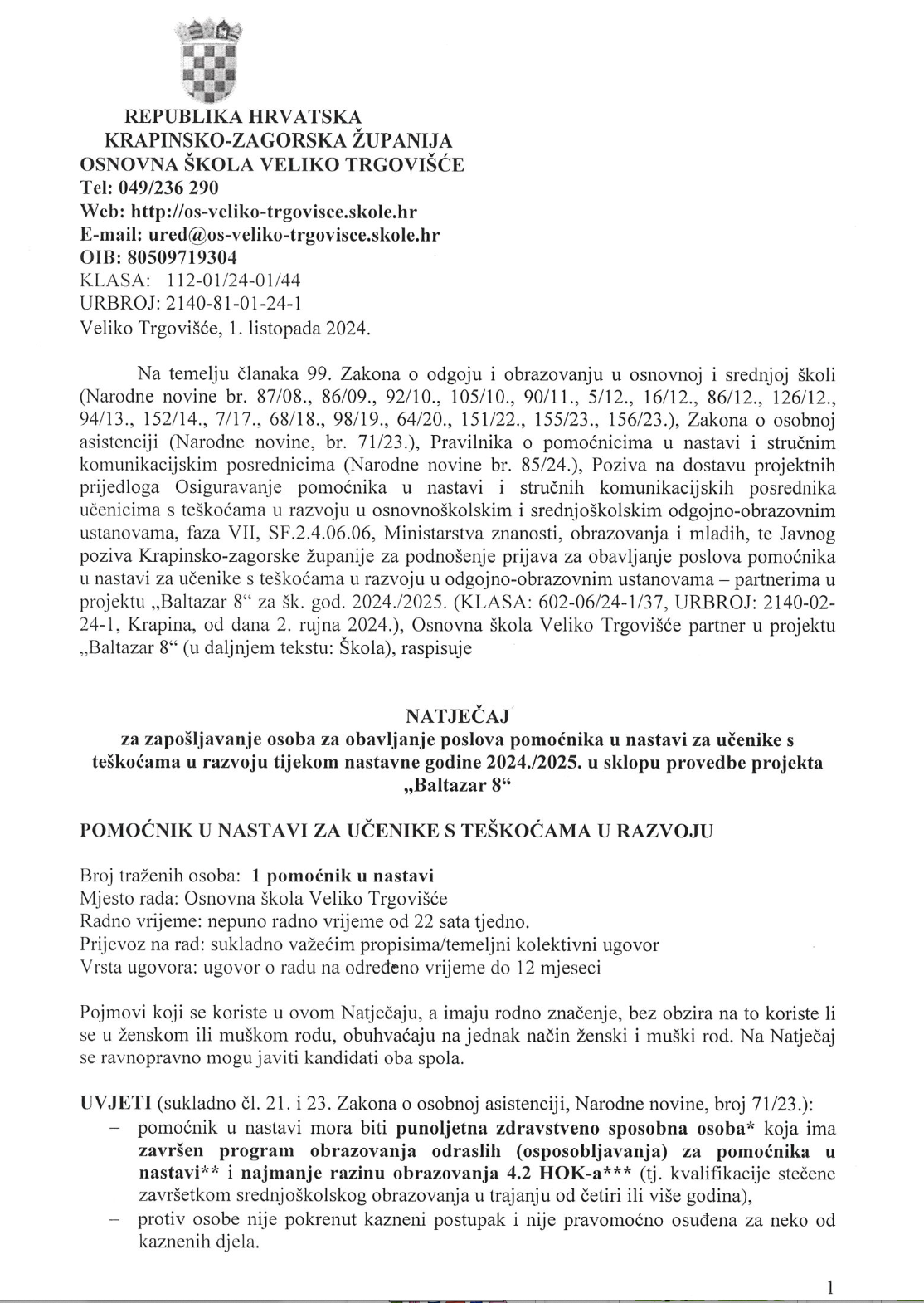 Natječaji za radno mjesto pomoćnik u nastavi za učenike s teškoćama u razvoju u sklopu provedbe projekta "Baltazar 8"