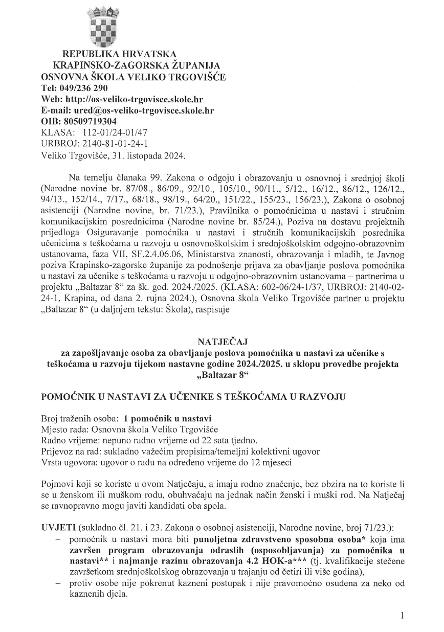 za zapošljavanje osoba za obavljanje poslova pomoćnika u nastavi za učenike s teškoćama u razvoju tijekom nastavne godine 2024./2025. u sklopu provedbe projekta „Baltazar 8"