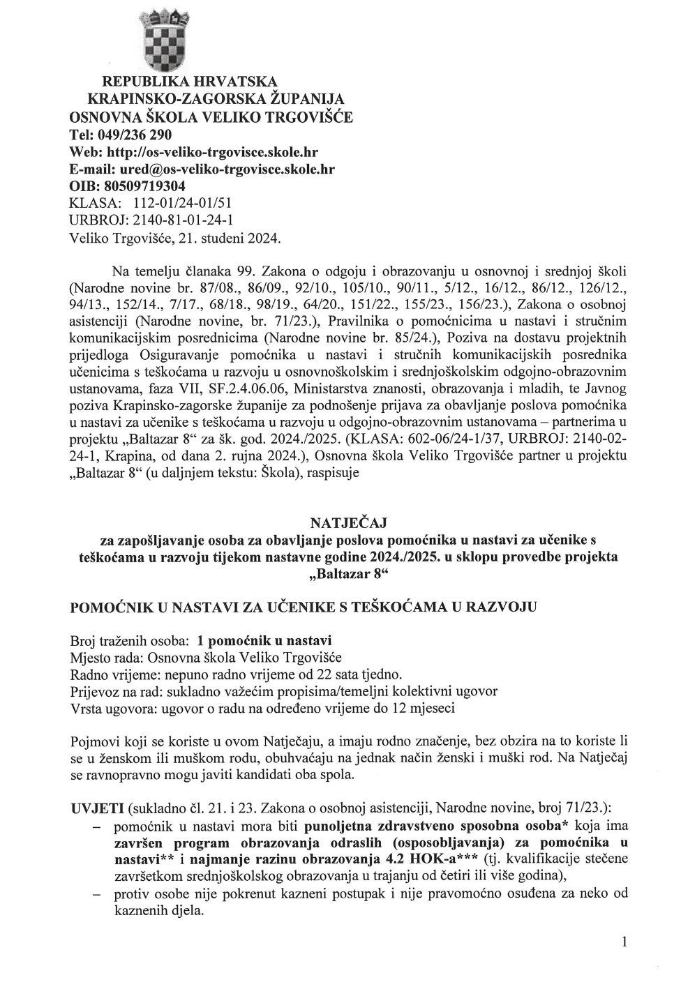 za zapošljavanje osoba za obavljanje poslova pomoćnika u nastavi za učenike s teskoćama u razvoju tijekom nastavne godine 2024./2025. u sklopu provedbe projekta „Baltazar 8"