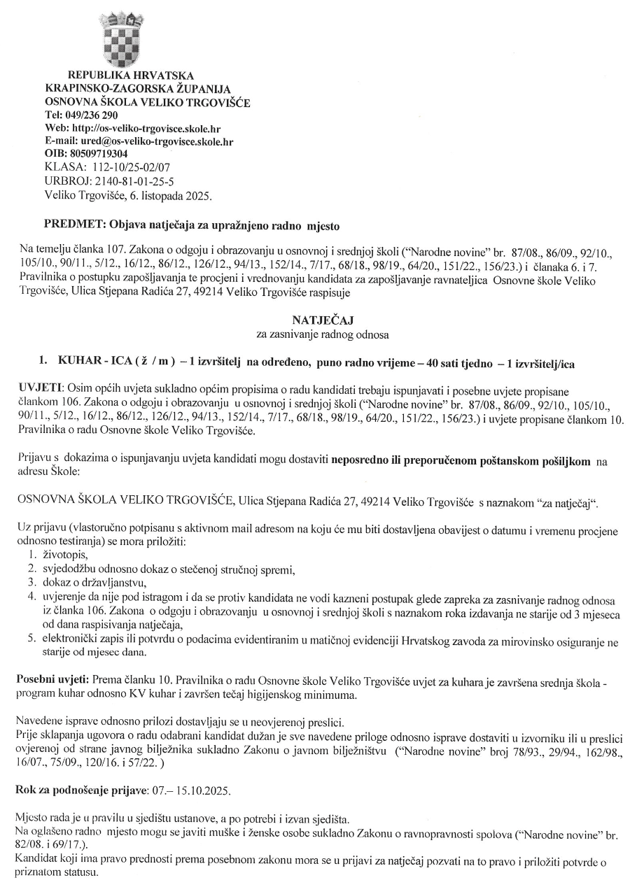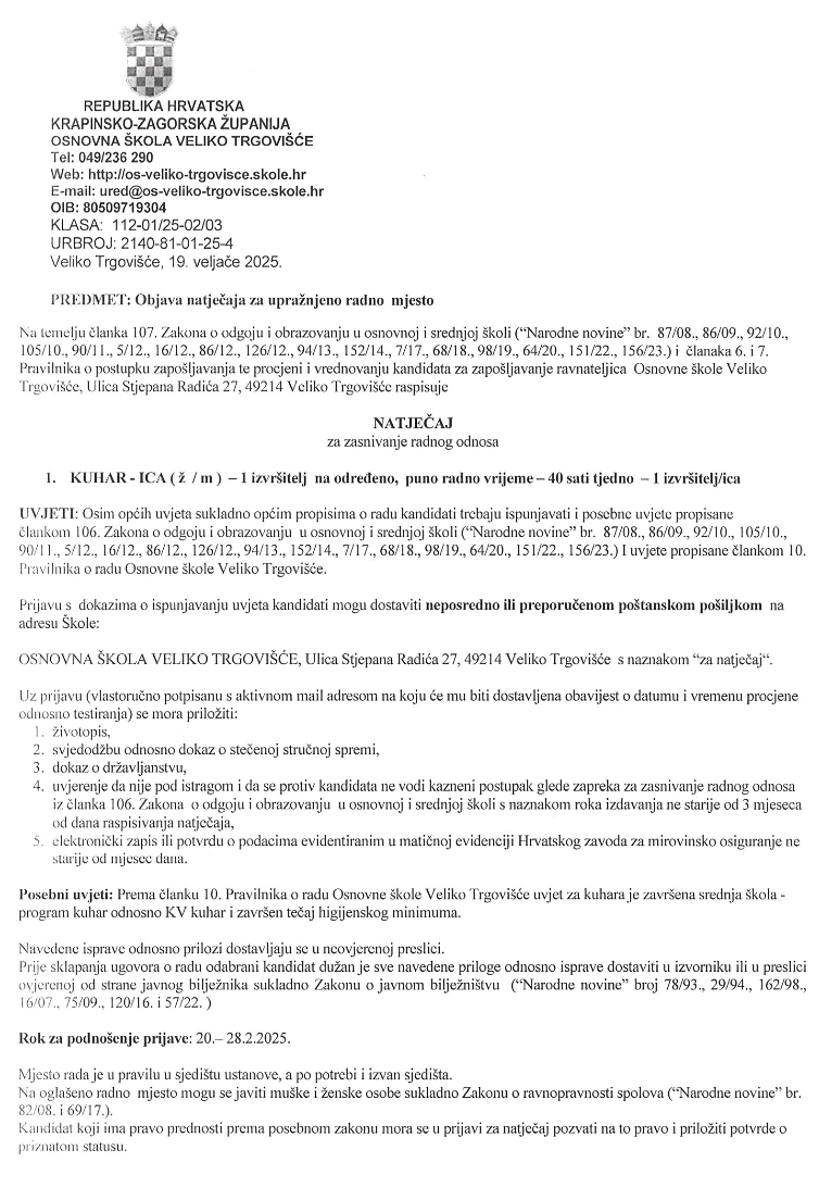1. KUHAR - ICA (ž / m) - 1 izvršitelj na određeno, puno radno vrijeme - 40 sati tjedno - 1 izvršitelj/ica