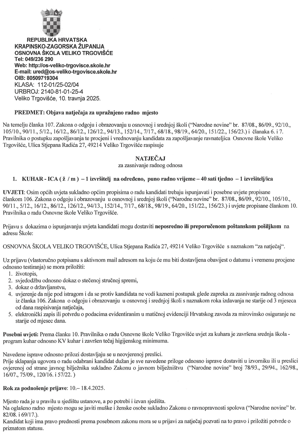 NATJEČAJ za zasnivanje radnog odnosa - KUHAR - ICA