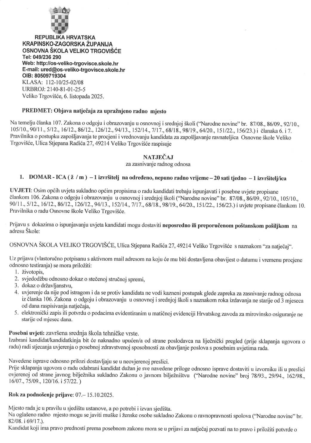 NATJEČAJ za zasnivanje radnog odnosa- DOMAR - ICA (ž / m)