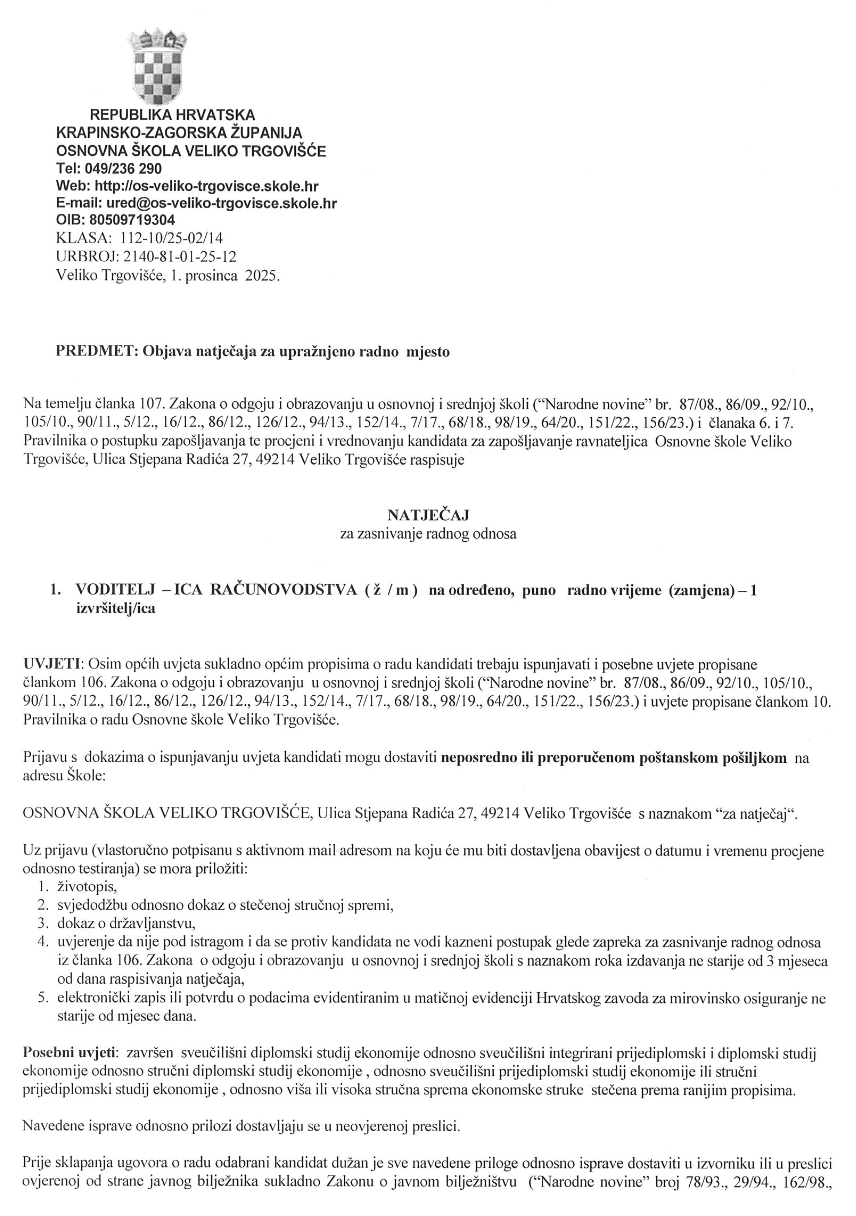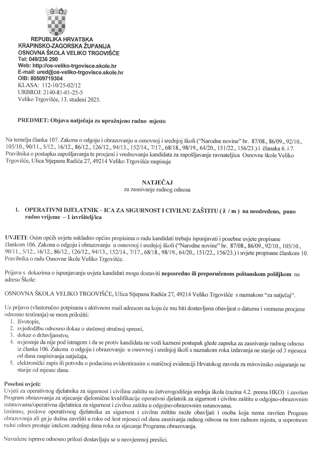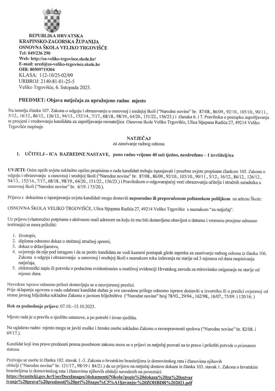 NATJEČAJ za zasnivanje radnog odnosa 1. UČITELJ-ICA RAZREDNE NASTAVE (ž / m)
