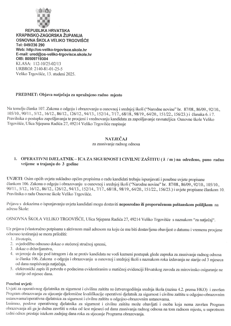1. OPERATIVNI DJELATNIK - ICA ZA SIGURNOST I CIVILNU ZAŠTITU (ž / m) na neodređeno, puno radno vrijeme - 1 izvršitelj/ica