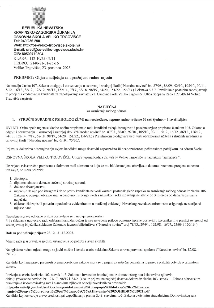 NATJEČAJ- STRUČNI SURADNIK PSIHOLOG