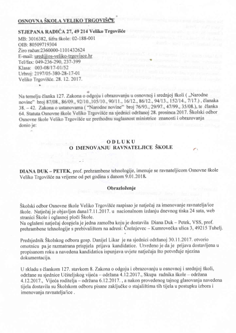 ODLUKU o IMENOVANJU RAVNATELJICE