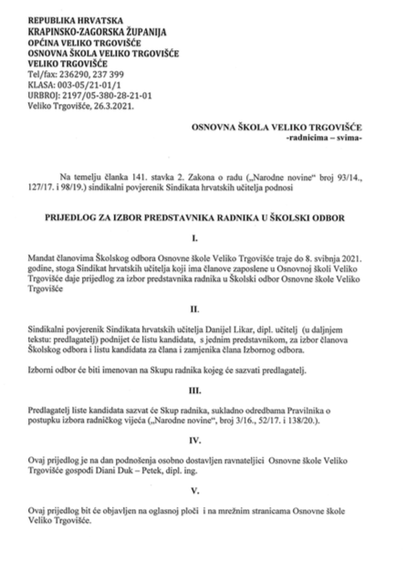 PRIJEDLOG ZA IZBOR PREDSTAVNIKA RADNIKA U ŠKOLSKI ODBOR