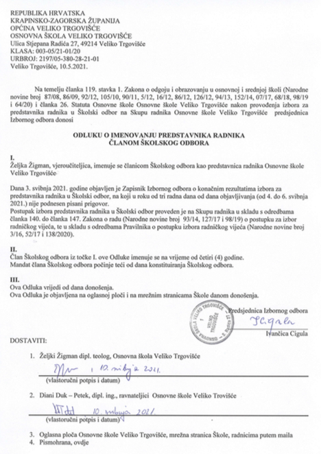 ODLUKA O IMENOVANJU PREDSTAVNIKA RADNIKA ČLANOM ŠKOLSKOG ODBORA