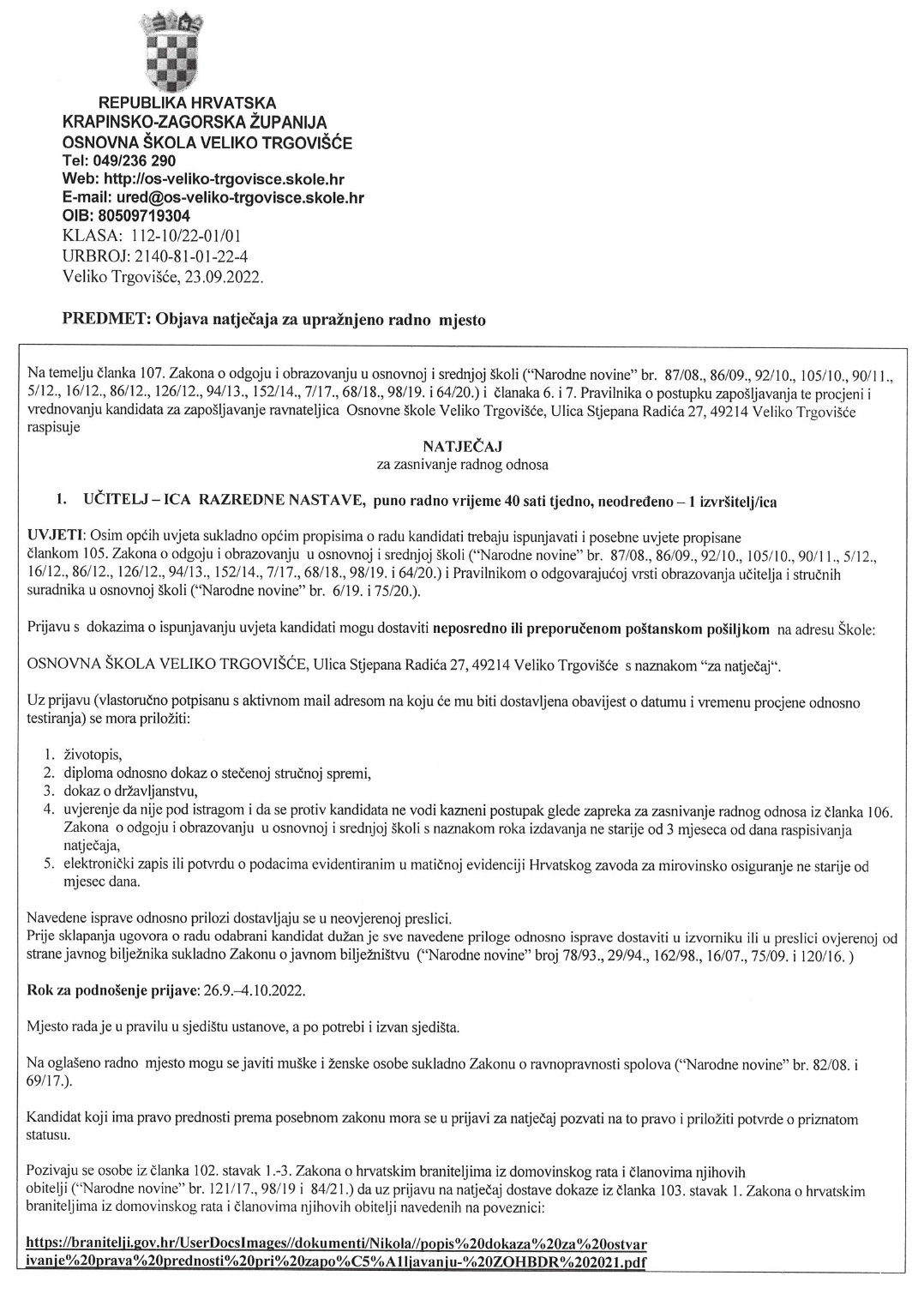 UČITELJ — ICA RAZREDNE NASTAVE, puno radno vrijeme 40 sati tjedno, neodređeno — 1 izvršitelj/ice