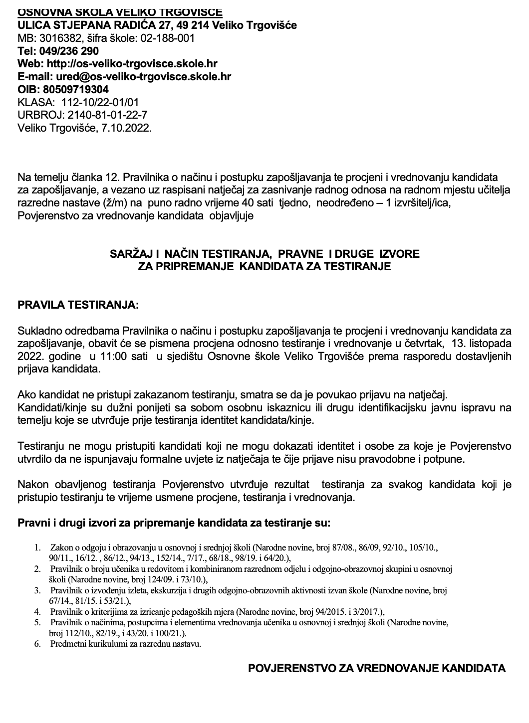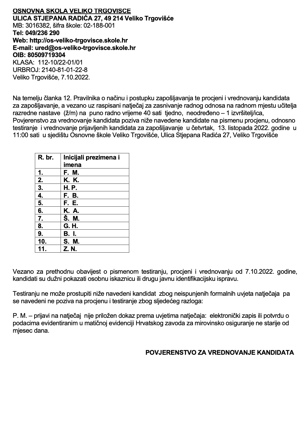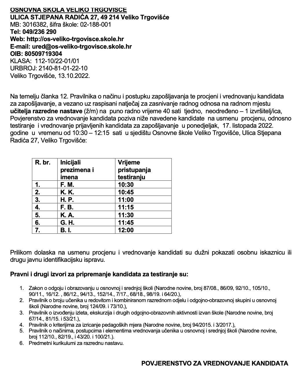 Poziv kandidatima za usmenu procjenu 17.10. - Razredna nastava 2022
