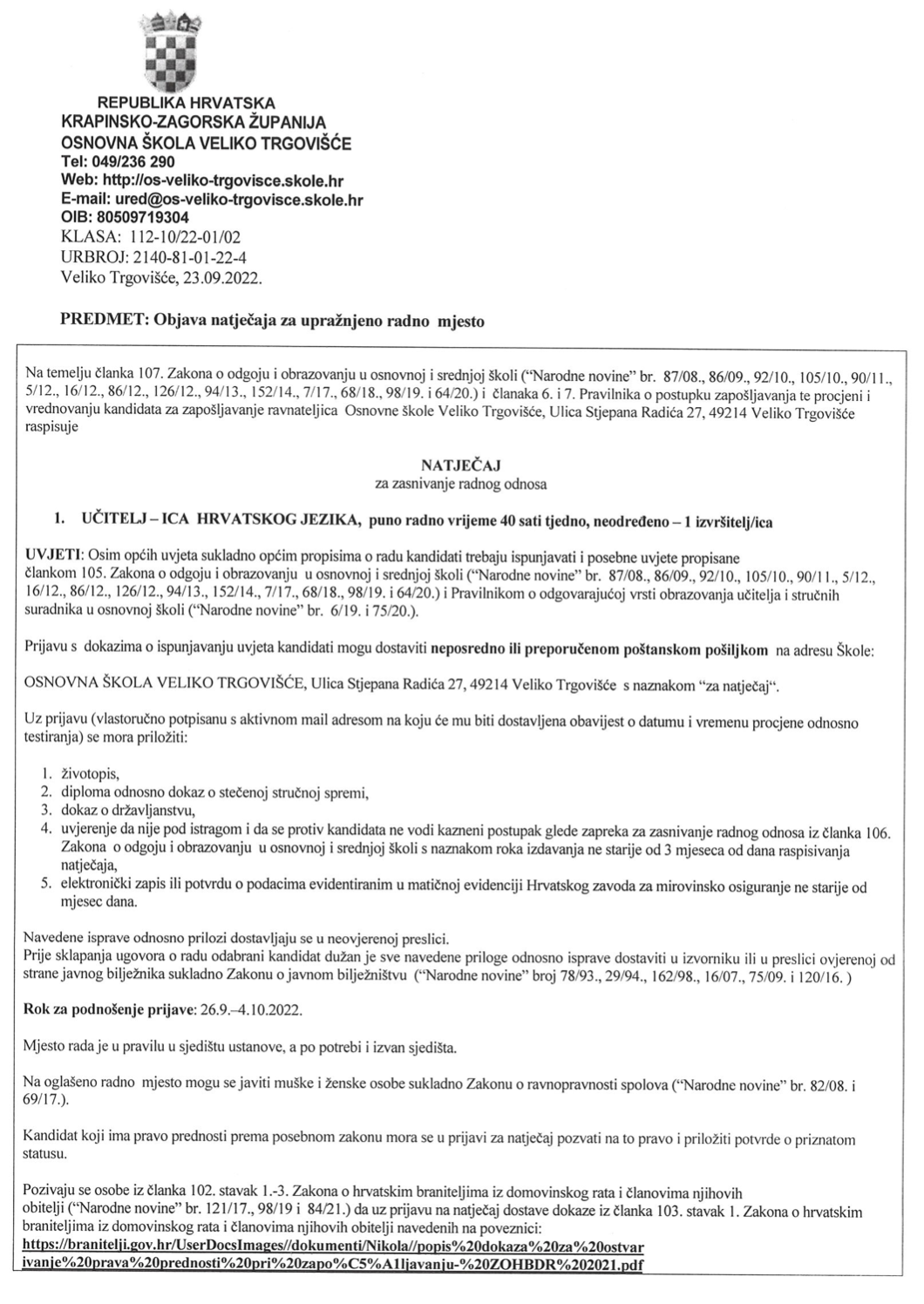 UČITELJ — ICA HRVATSKOG JEZIKA, puno radno vrijeme 40 sati tjedno, neodređeno — 1 izvršitelj/ice