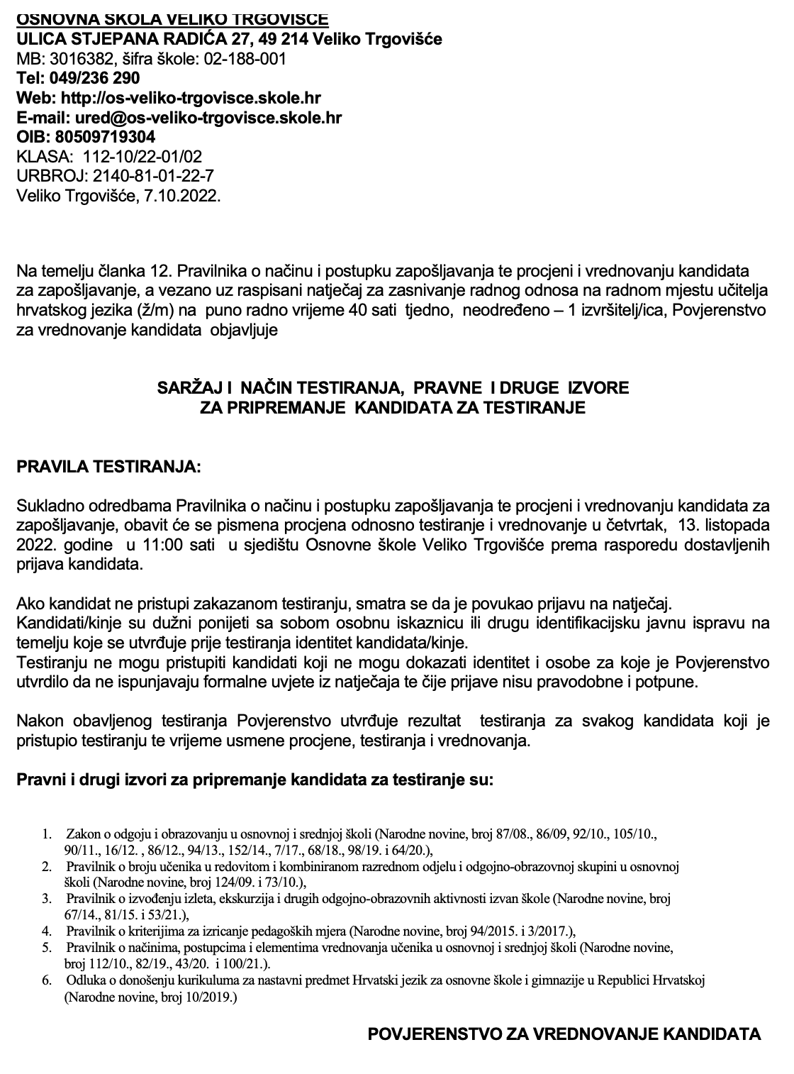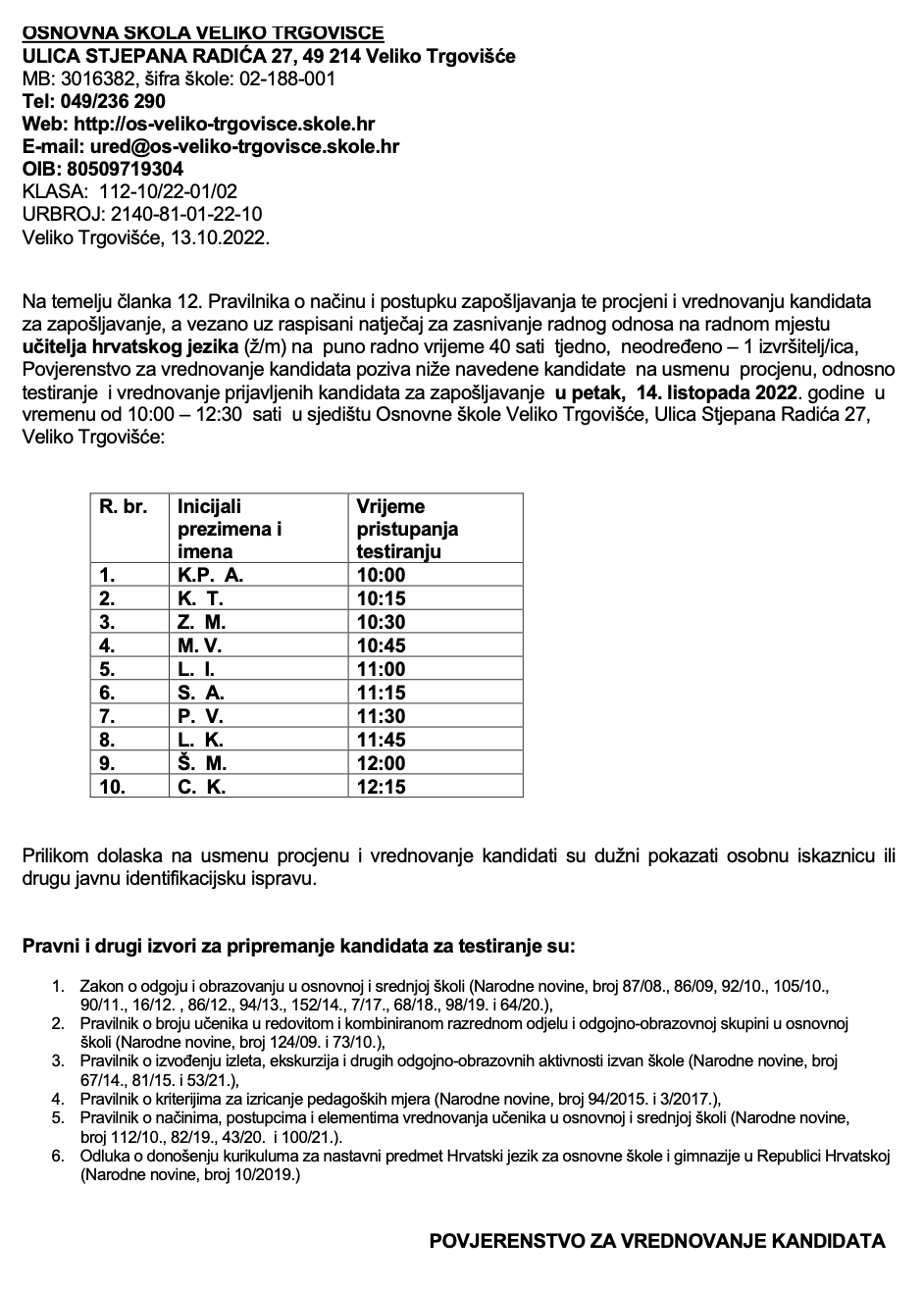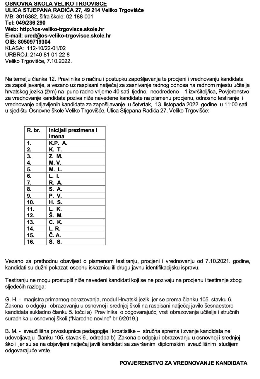 Obavijest kandidatima o odabiru kandidata za učitelja Hrvatskog jezika