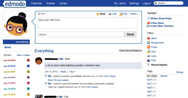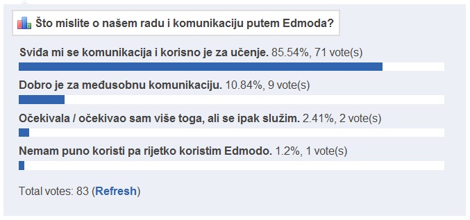Učenicima sam dala mogućnost pristupanja mreži potpuno dobrovoljno, a uključilo se približno tri četvrtine mojih učenika. No, njihova aktivnost je vrlo različita, dok jedni rado preuzimaju zadatke za vježbu prije provjere znanja, drugima je važna komunikacija. Vrlo brzo su shvatili da im Edmodo može pomoći kod rješavanja bilo kakvih problema u školi, da mogu dobiti odgovor na sva pitanja vezana uz nastavu, u bilo koje doba dana. Raduje me što Edmodo koriste kao mjesto za razmjenu iskustava i iz drugih nastavnih predmeta. Kroz ovakvu