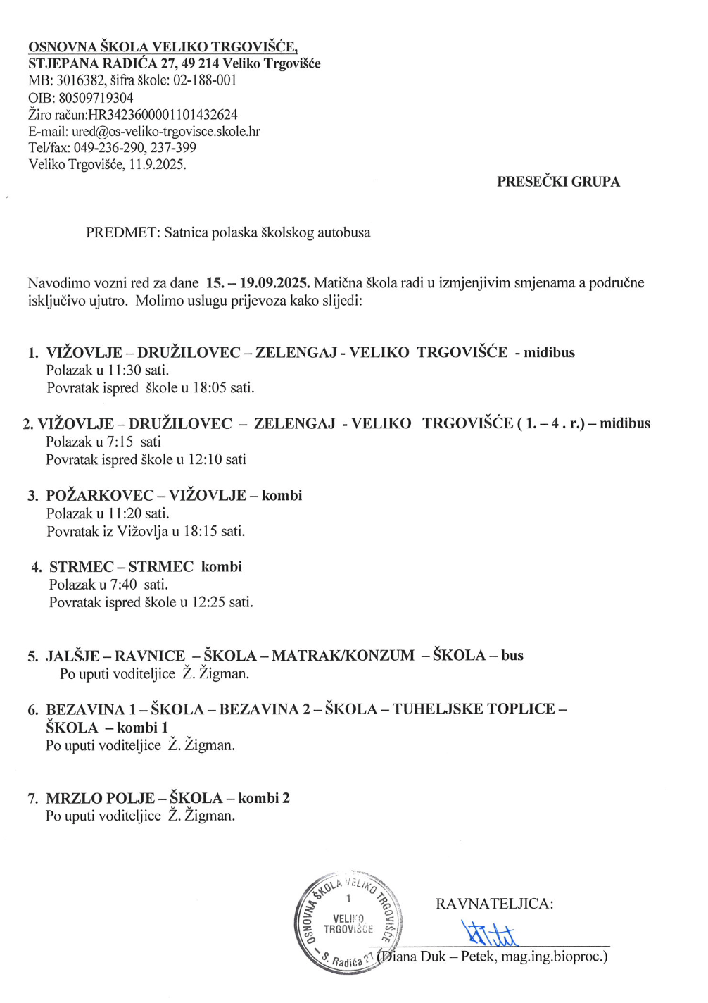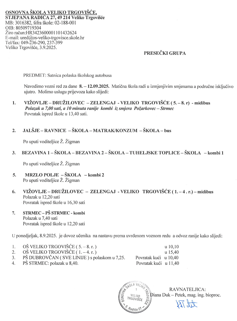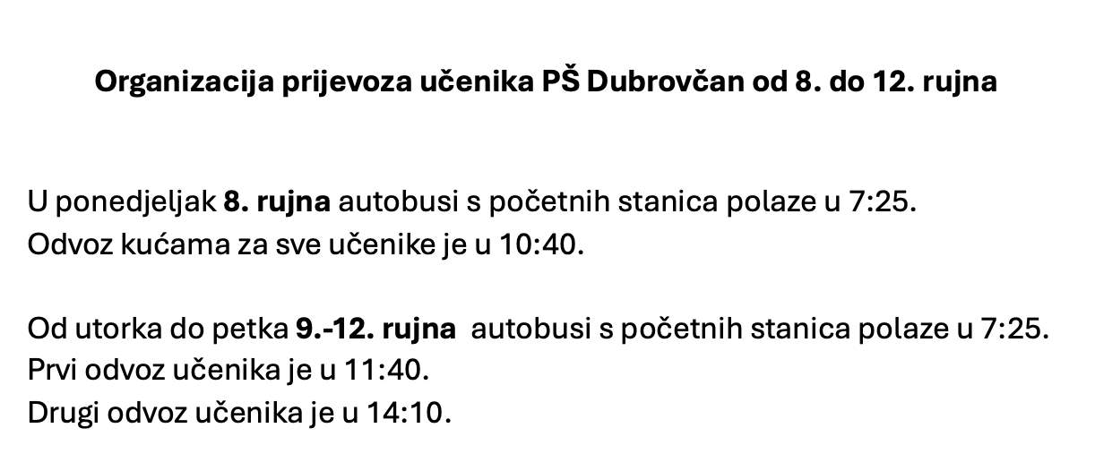Satnica polaska školskog autobusa, za prvi tjedan