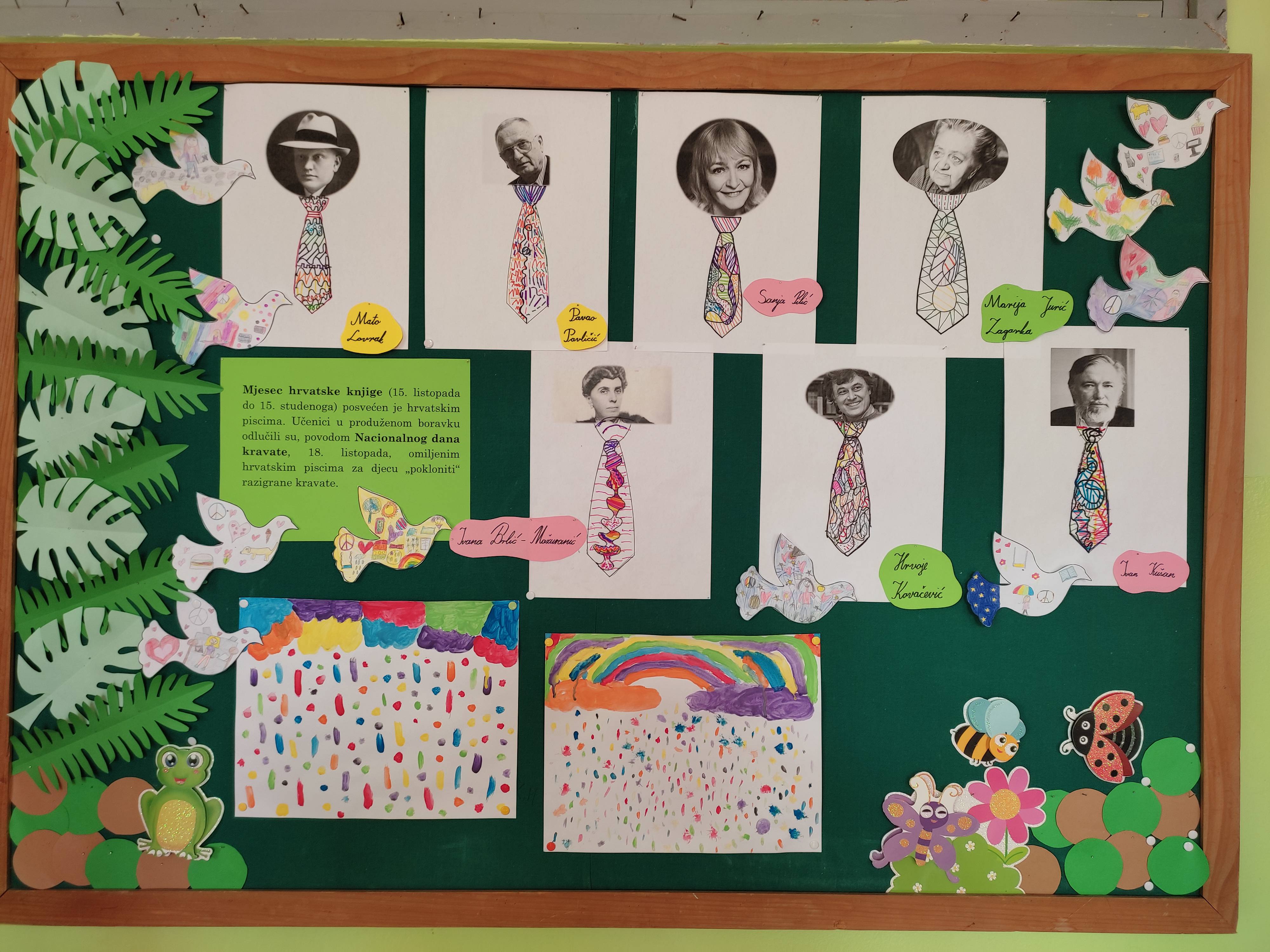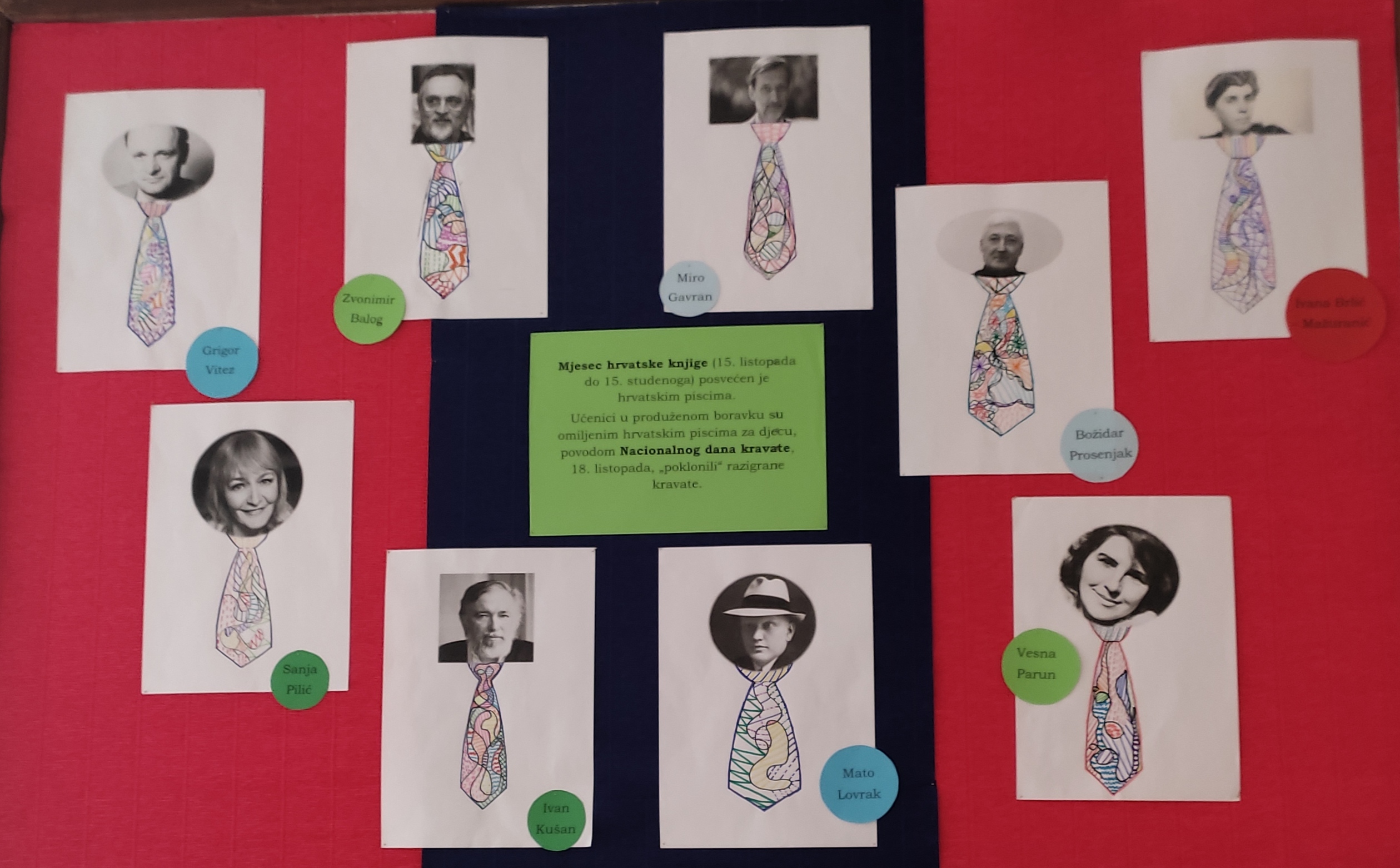 Na početku Mjeseca hrvatske knjige, koji je ove godine posvećen hrvatskim književnicima pod motom Ajmo HRVATI se s knjigom obilježili smo Nacionalni dan kravate (18. listopada). Učenici u produženom boravku omiljenim su hrvatskim književnicima nacrtali razigrane kravate.