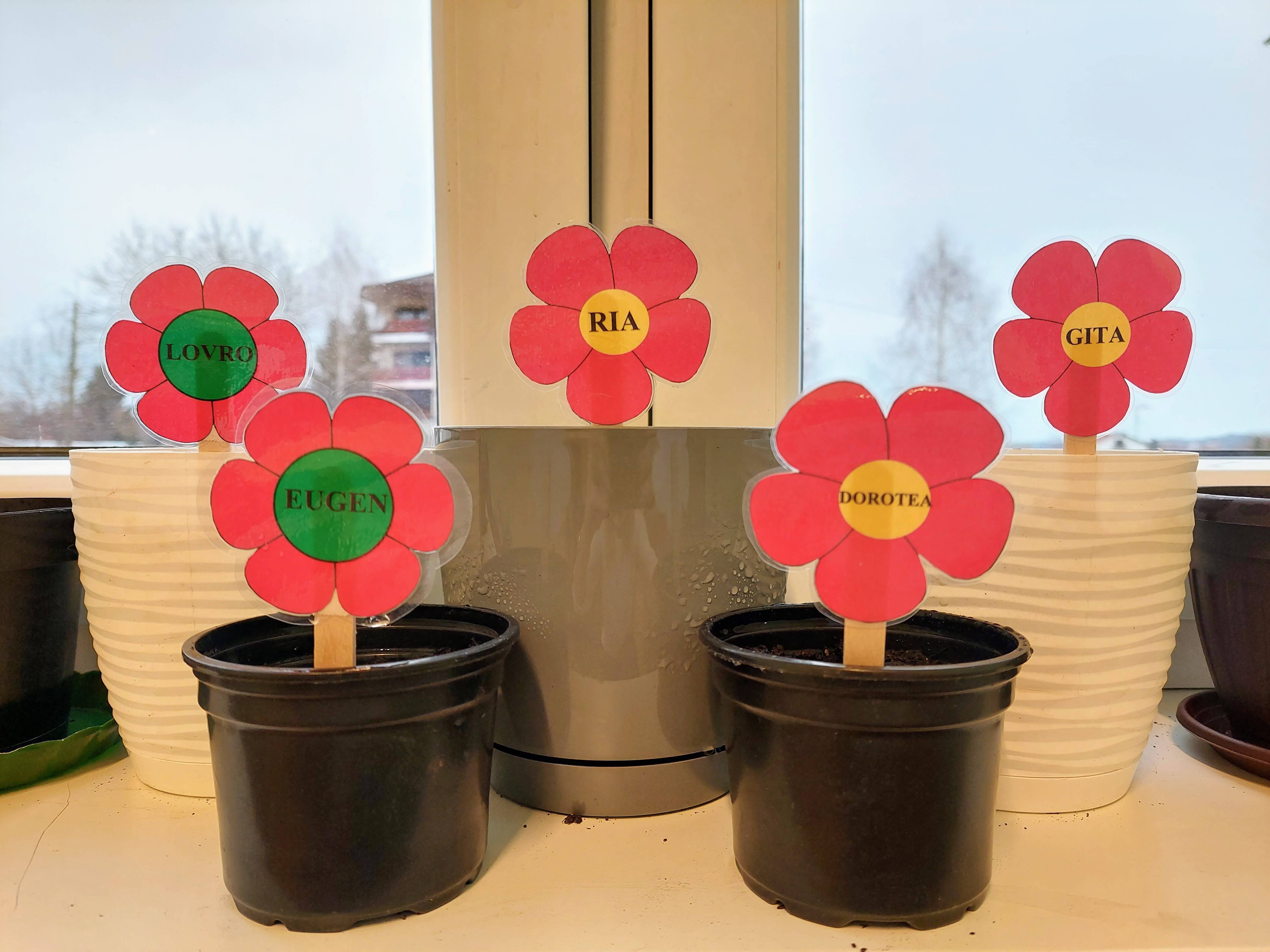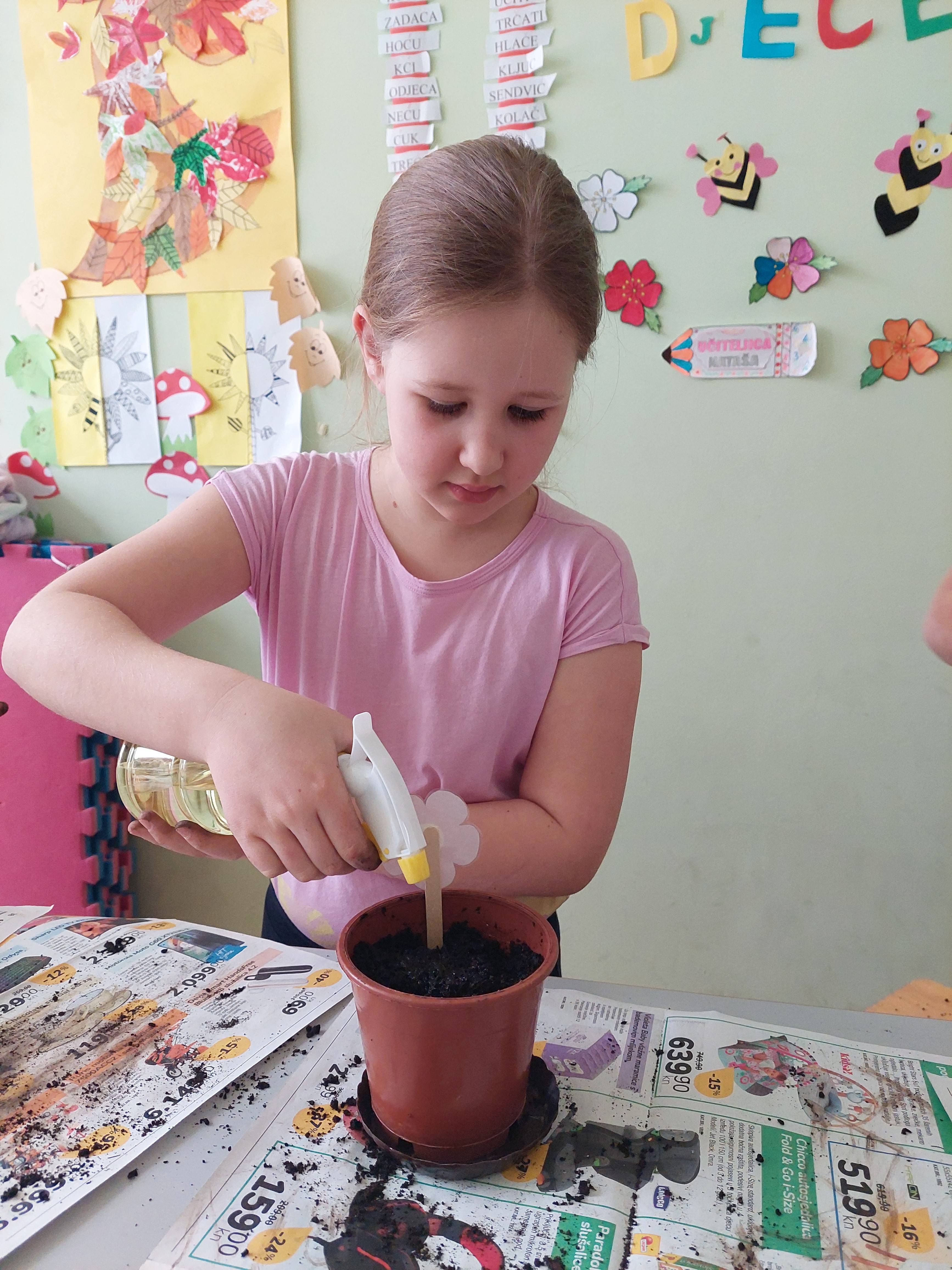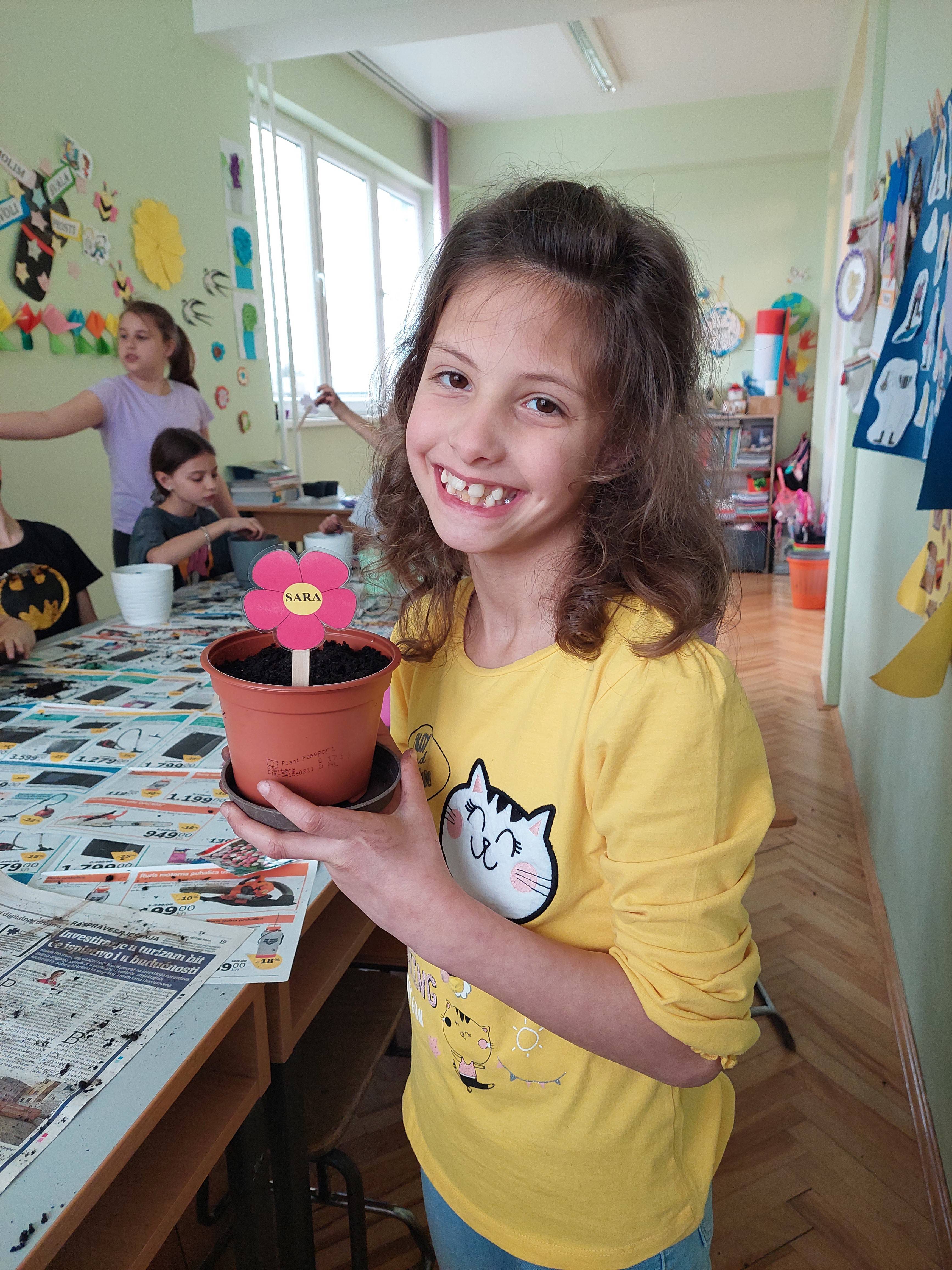 Dolazak proljeća najavljuje nam prozor učionice produženog boravka kojega krase cvjetići s imenima učenika. Učenici su zajedno s učiteljicom malo „uprljali“ ruke i posijali cvijeće. U idućim tjednima promatrat ćemo kako naše biljke klijaju i polako rastu; pružit ćemo im puno pažnje i ljubavi kako bi na kraju mogli uživati u plodovima svoga truda – lijepim i šarenim cvjetovima.