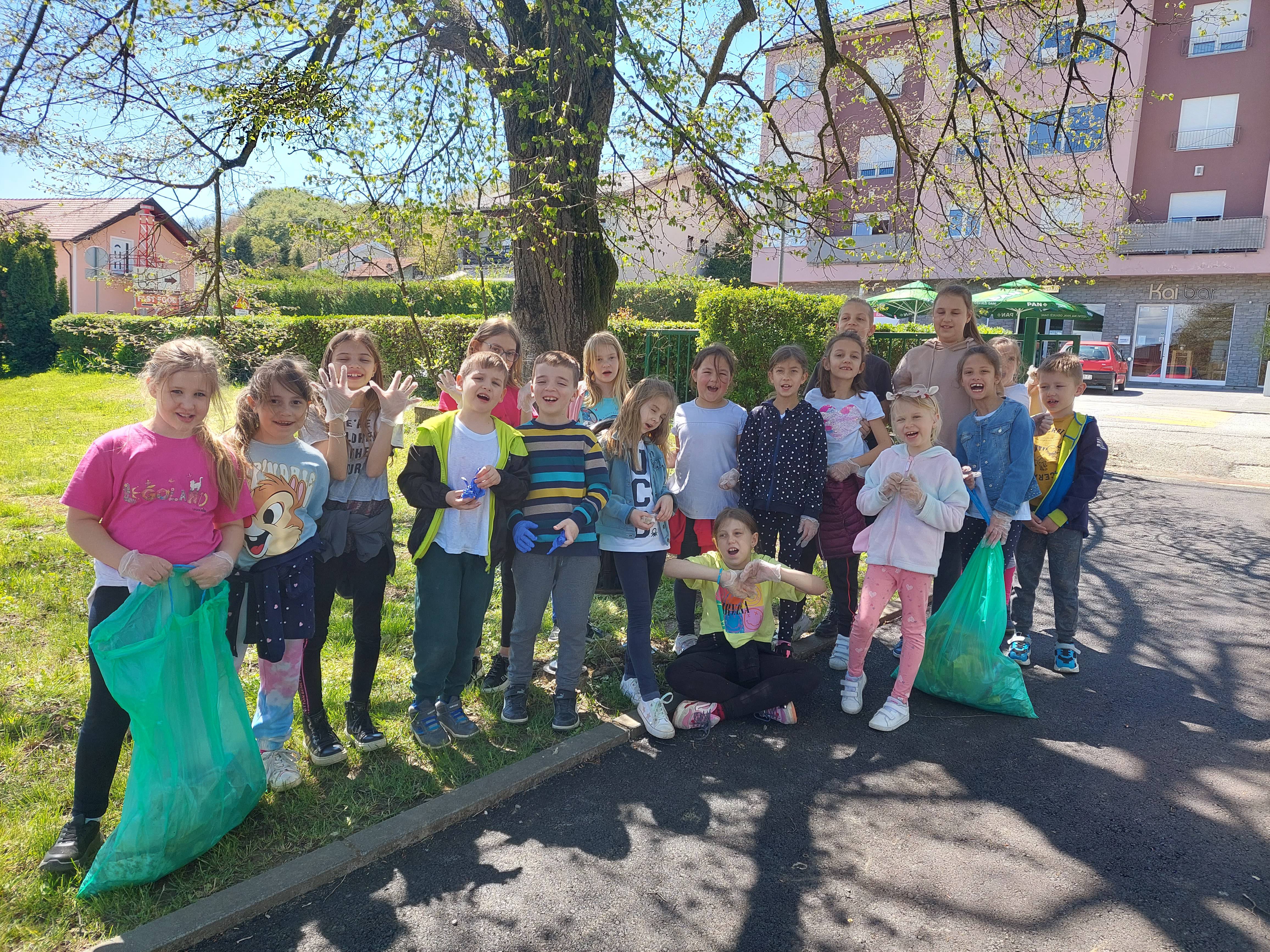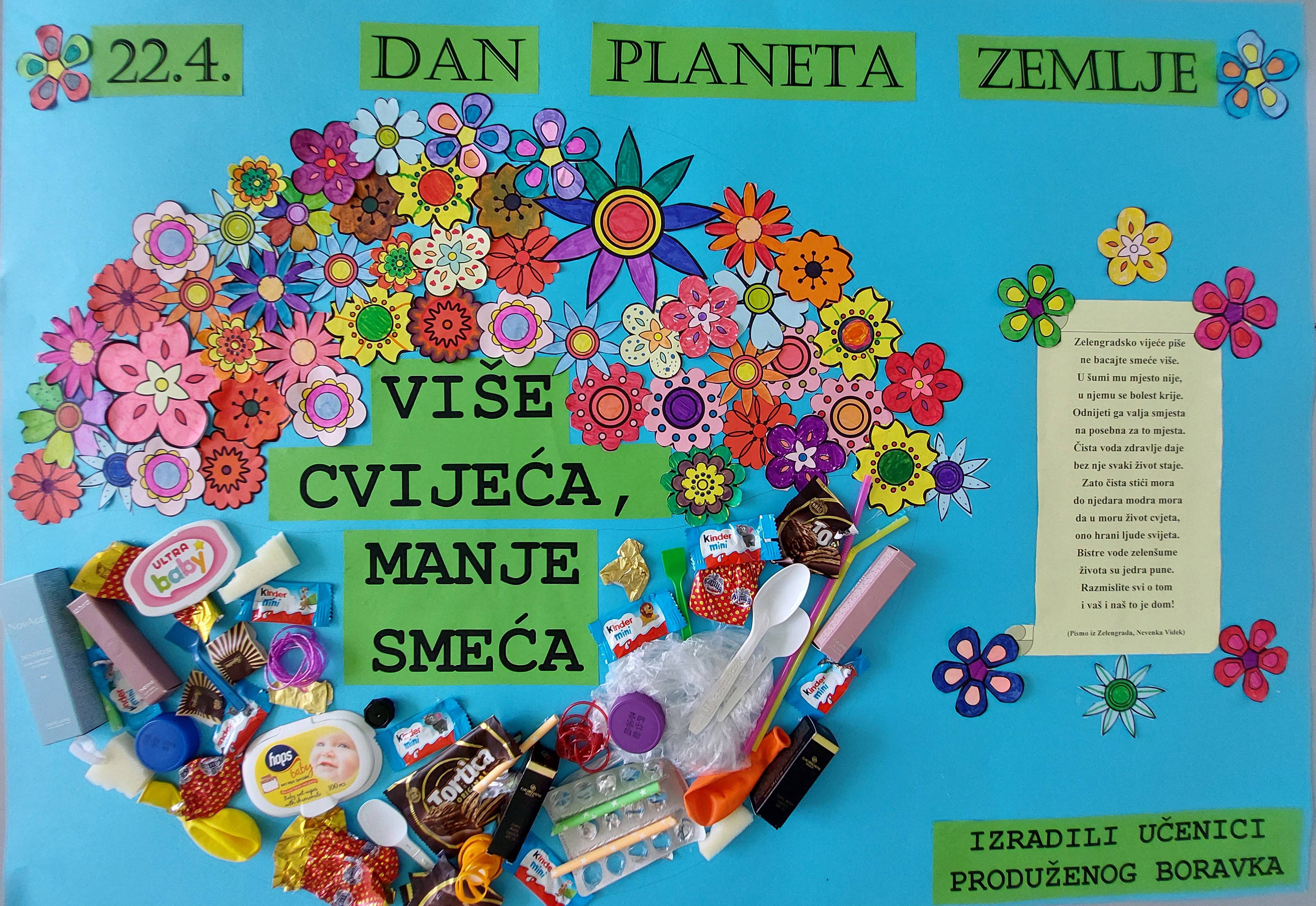 Budući da je naš planet, Zemlja, proslavio rođendan 22.4. kada su učenici bili na Uskrsnim praznicima odlučili smo cijeli tjedan po povratku u školu posvetiti upravo njemu. U ponedjeljak smo navukli rukavice na ruke, uzeli vreće za smeće i krenuli u šetnju; no ne uobičajenu šetnju, nego „radnu šetnju“. Naime tijekom šetnje sakupljali smo smeće u okolici škole, točnije po ruti kojom inače svakodnevno šećemo. Bilo je tu svega: boca, limenki, staklenki, medicinskih maski, papirića, opušaka…. pa smo se iz šetnje vratili s punim vrećama smeća. Bili smo umorni, ali i sretni jer je naša „šetnica“ sada čista; nadamo se da će takva i ostati. U ponedjeljak smo također slušali i priču „Pismo iz Zelengrada“ autorice Nevenke Videk. Učenicima se priča jako svidjela i shvatili su da su danas i oni baš poput životinja iz priče sakupljali smeće koje je netko drugi bacio. U ponedjeljak smo bili jako marljivi te smo uspjeli napraviti i eko plakat sa sloganom „VIŠE CVIJEĆA, MANJE SMEĆA“. U utorak smo pjevali Eko himnu: „…Ekolozi smo ti i ja, u očima nam sunce sja.