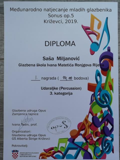 Učenik 7.b razreda Saša Miljanović već četvrtu godinu zaredom sudjeluje na natjecanju mladih glazbenika Sonus op. 5 u Križevcima i treći put osvaja prvu nagradu (94,00 bodova) u kategoriji udaraljke.