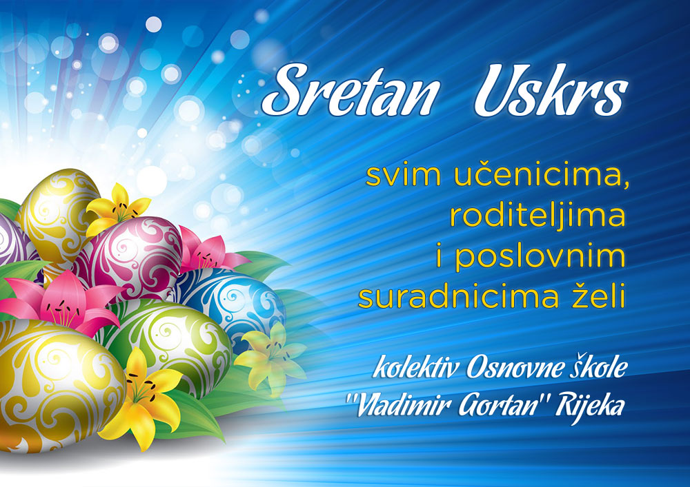 Čestitka kolektiva Osnovne škole "Vladimir Gortan" svim učenicima, roditeljima i poslovnim suradnicima povodom blagdana Uskrsa.